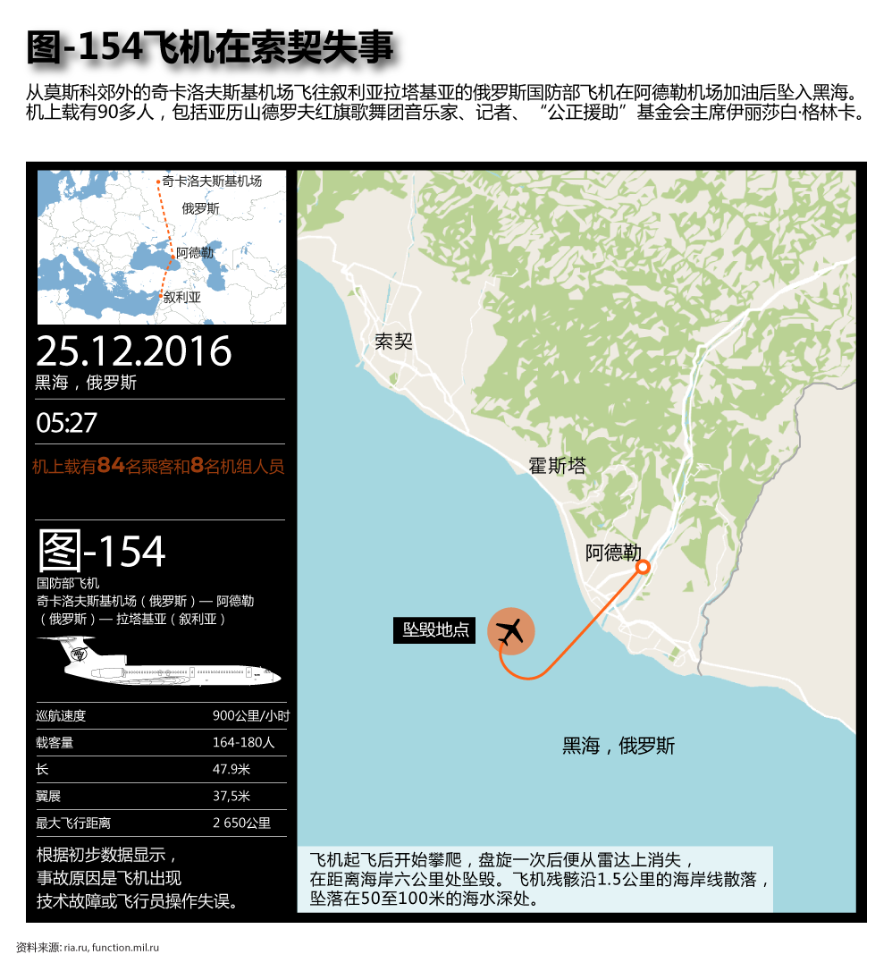 俄罗斯国防部一架图-154飞机12月25日在黑海坠毁。据俄国防部消息称,飞机上有92人,分别为8名机组成员和84名乘客,其中8名为军人,此外还有64名亚历山德罗夫红旗歌舞团演员、9名俄罗斯媒体代表、“公正援助”基金会负责人伊丽莎白∙格林卡以及两名官员。