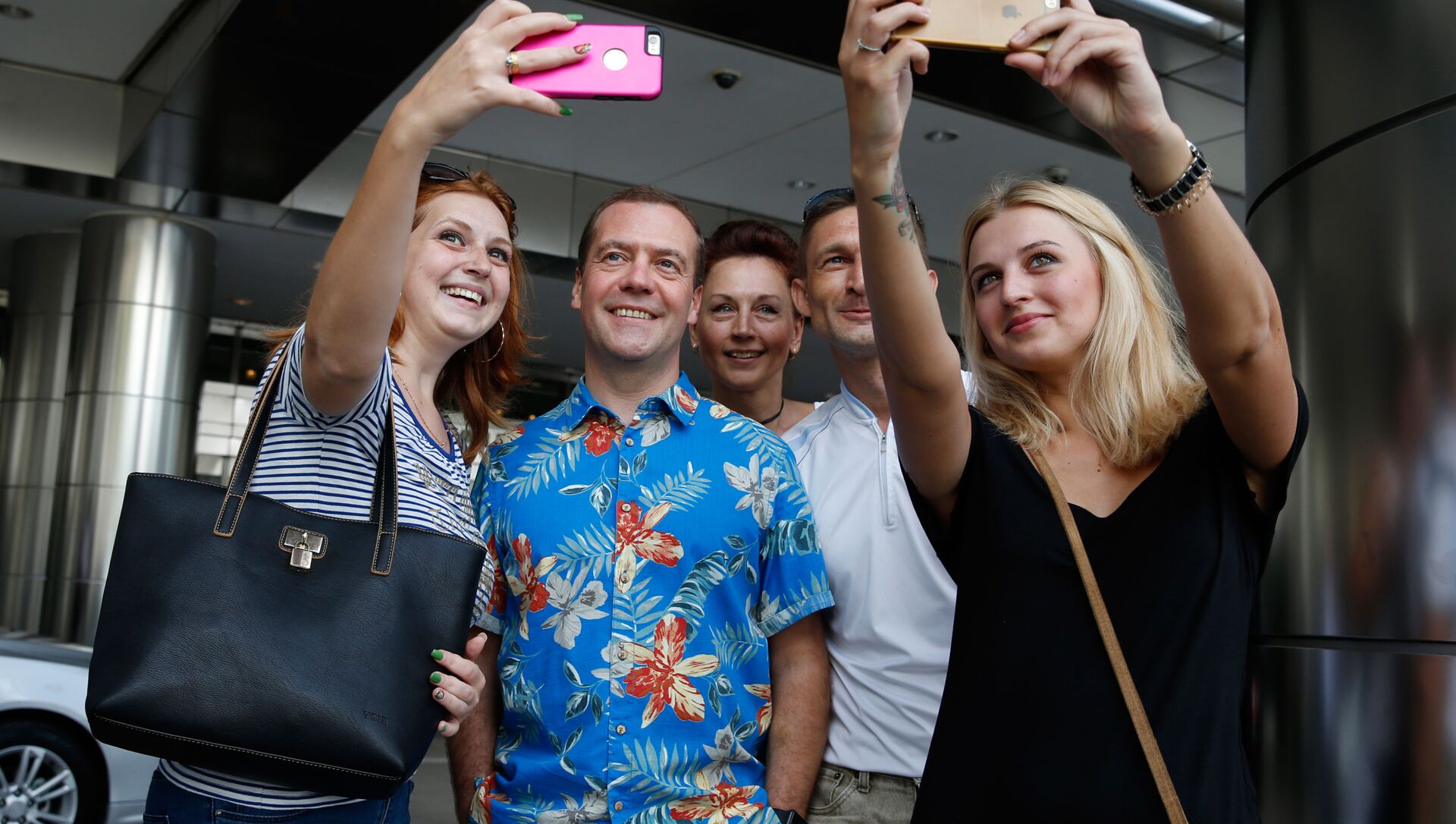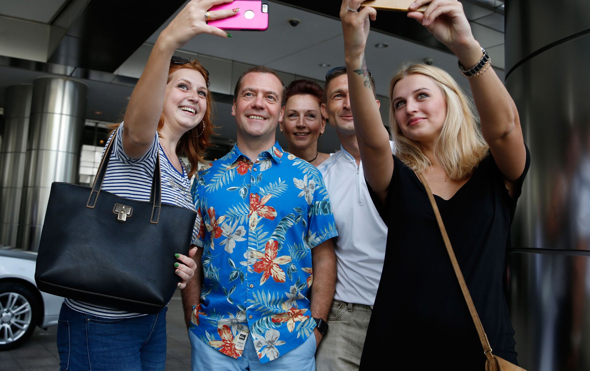 © Sputnik / Dmitry Astakhov2015年11月22日,俄总理梅德韦杰夫参观马兰西亚首都吉隆坡景点期间与俄罗斯及乌克兰游客合影。