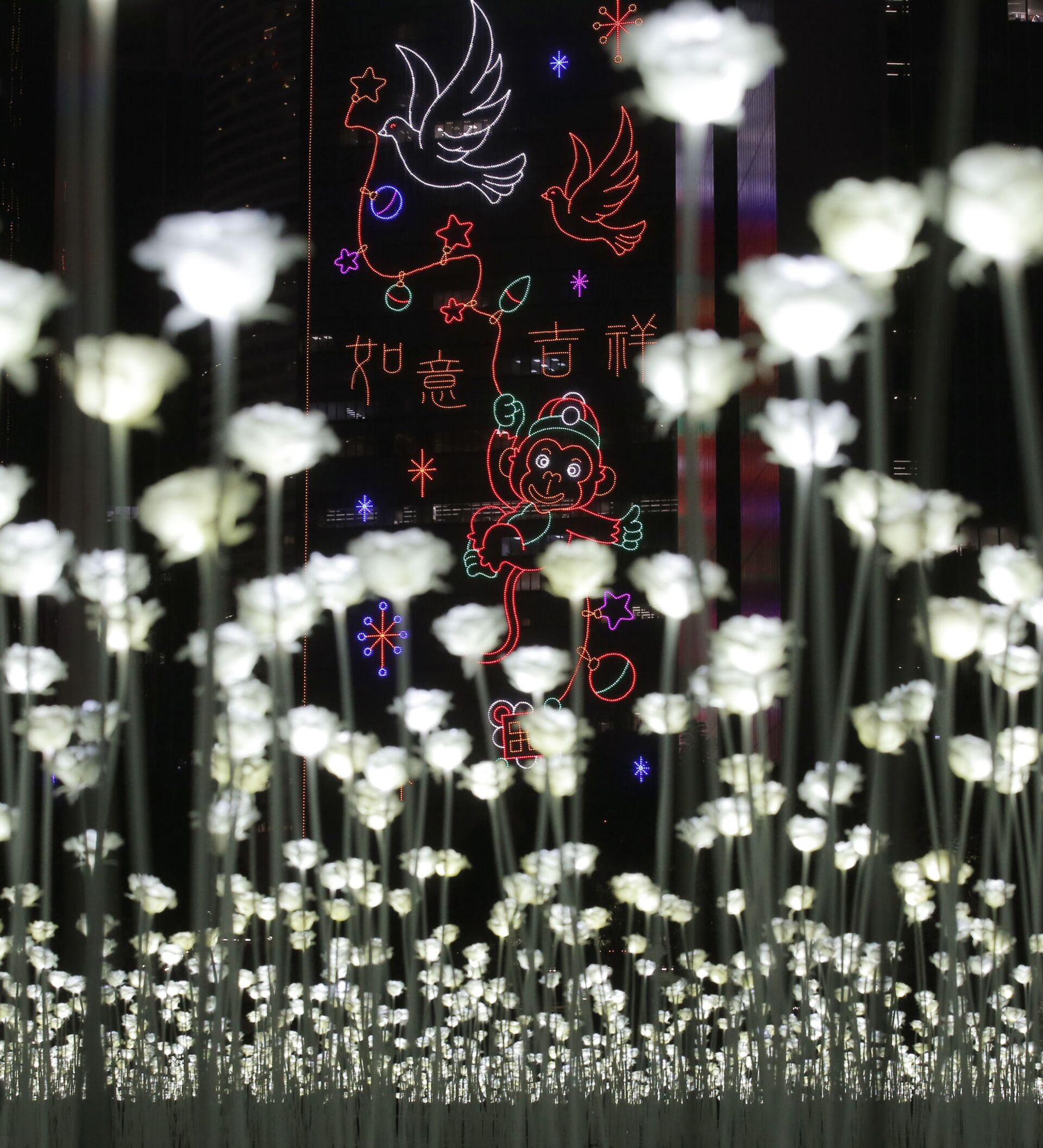 © AP Photo / Kin Cheung这是在中环海滨拍摄的白玫瑰花灯(2月13日摄)。 2月13日,来自韩国首尔的LED Rose Garden大型公共展览亮相香港。25000朵LED白玫瑰花灯在中环海滨展出,在情人节即将到来之际点亮维港,营造出浪漫甜蜜的氛围。