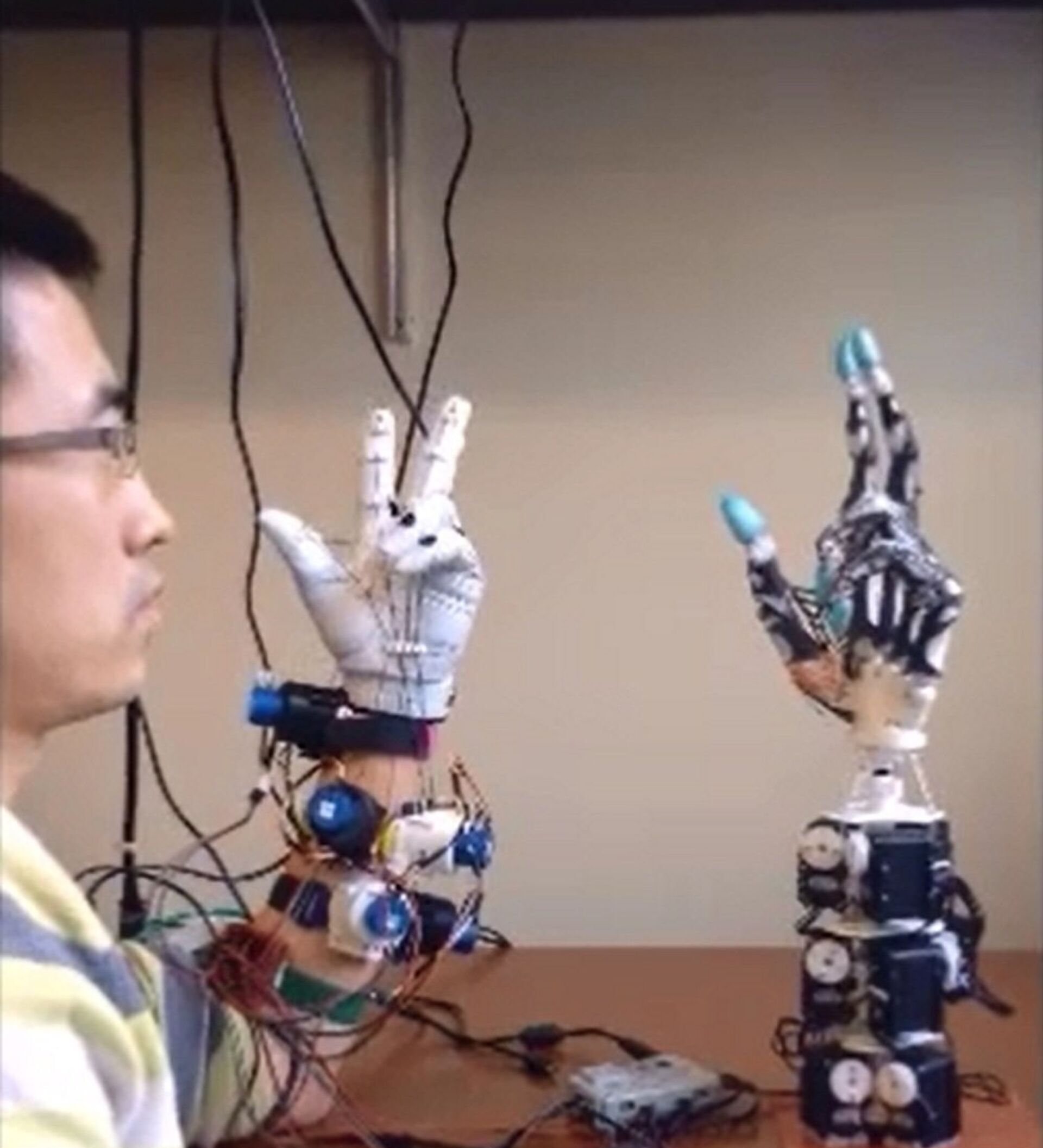 骨头复制品用3D打印机打印,韧带和肌腱部分用塑料绳做成,手部柔软的可替代性软组织用激光切割的橡胶碎块代替,10个伺服马达充当肌肉。制作而成的机械与装在操作者手上的感应器连接在一起