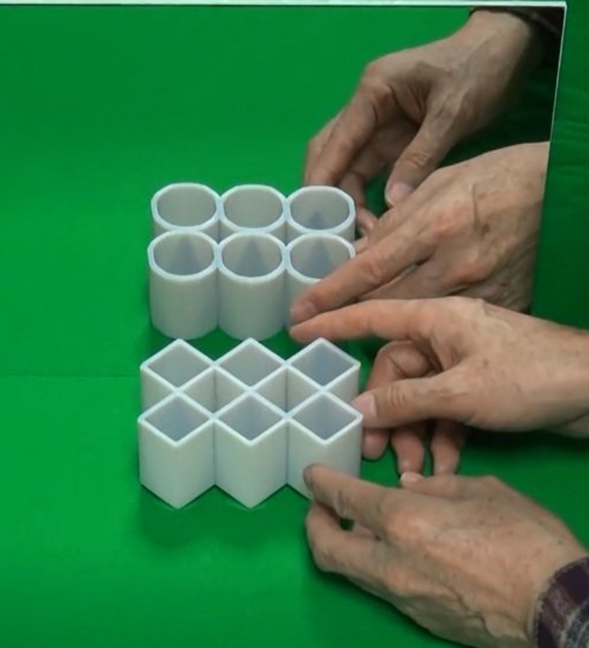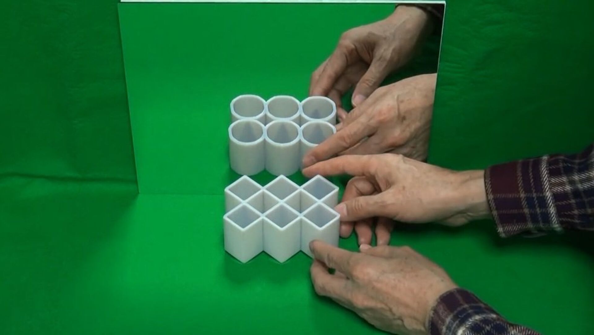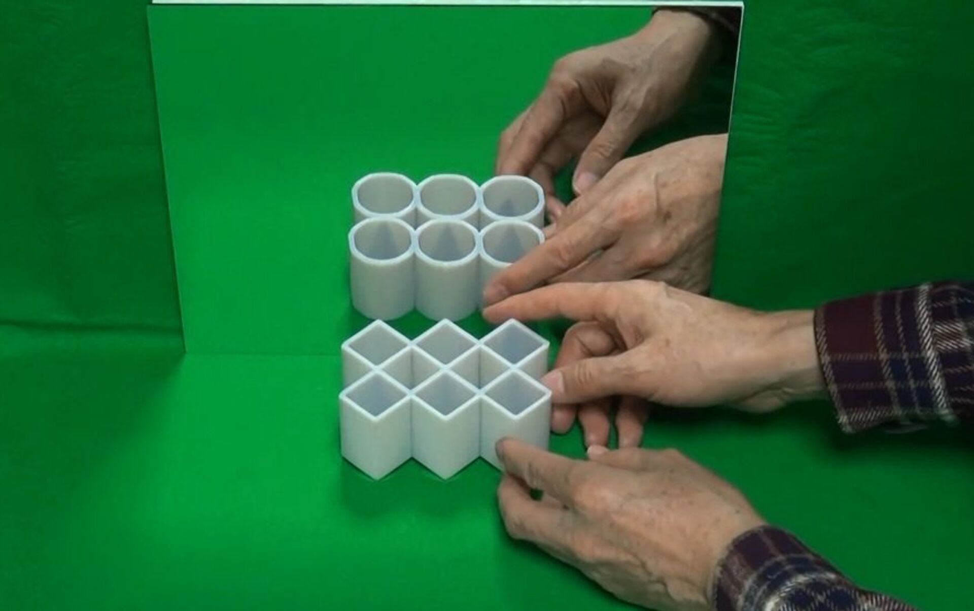 田纲吉杉展示了事实物体和镜中影像的天壤之别。他在镜子前摆放各式各样的几何形状,而我们在镜子里看到的物体形状却与它们本身完全不同。圆形是方形,而方形却是圆形。