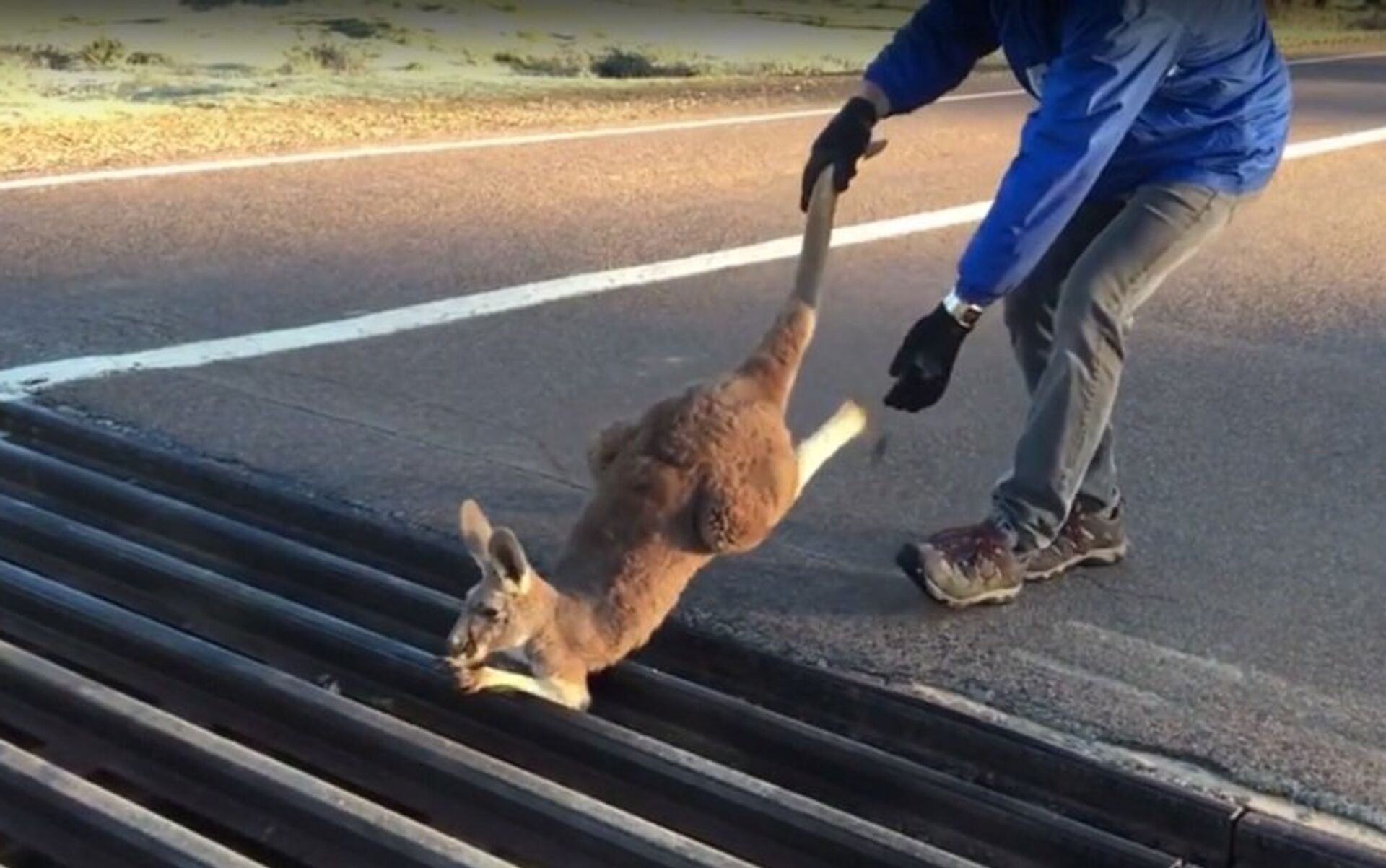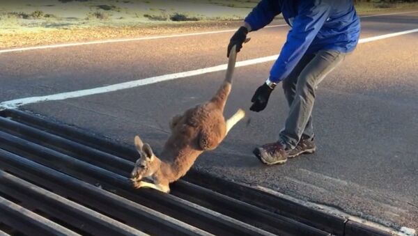 一只小袋鼠绝望地卡在了马路中间的栏杆上。有人看到这一幕后,拉着小袋鼠的爪子和尾巴,将它救了出来。小袋鼠一获救就跳着跑开了,甚至没向救命恩人表达谢意。 2016年8月2日, 俄罗斯卫星通讯社