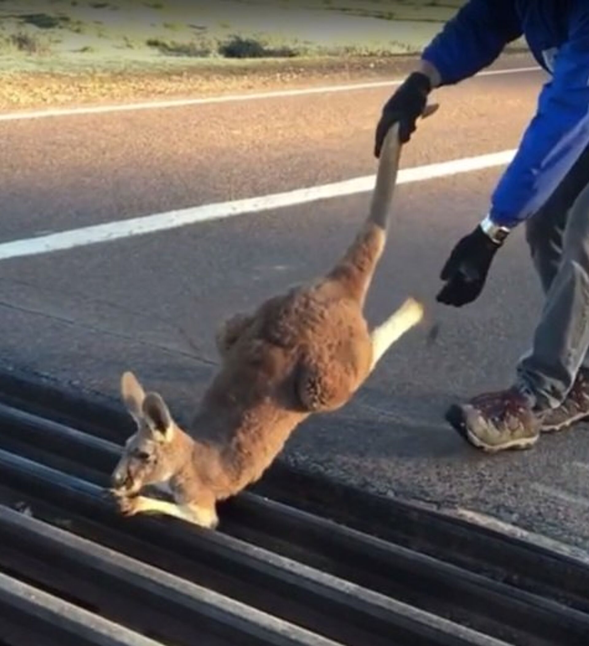 一只小袋鼠绝望地卡在了马路中间的栏杆上。有人看到这一幕后,拉着小袋鼠的爪子和尾巴,将它救了出来。小袋鼠一获救就跳着跑开了,甚至没向救命恩人表达谢意。