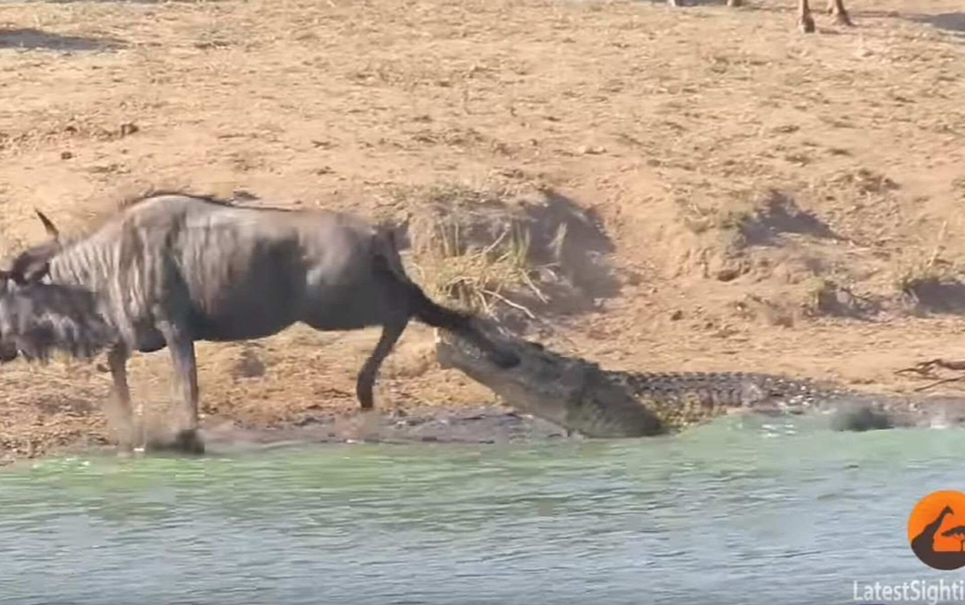 视频中,尽管牛羚奋力挣扎,但结果毫无悬念,逃脱无望,被鳄鱼缓缓拖入水中。然而,两只河马的突然出现彻底改变了故事的结局。