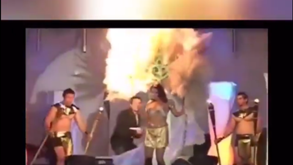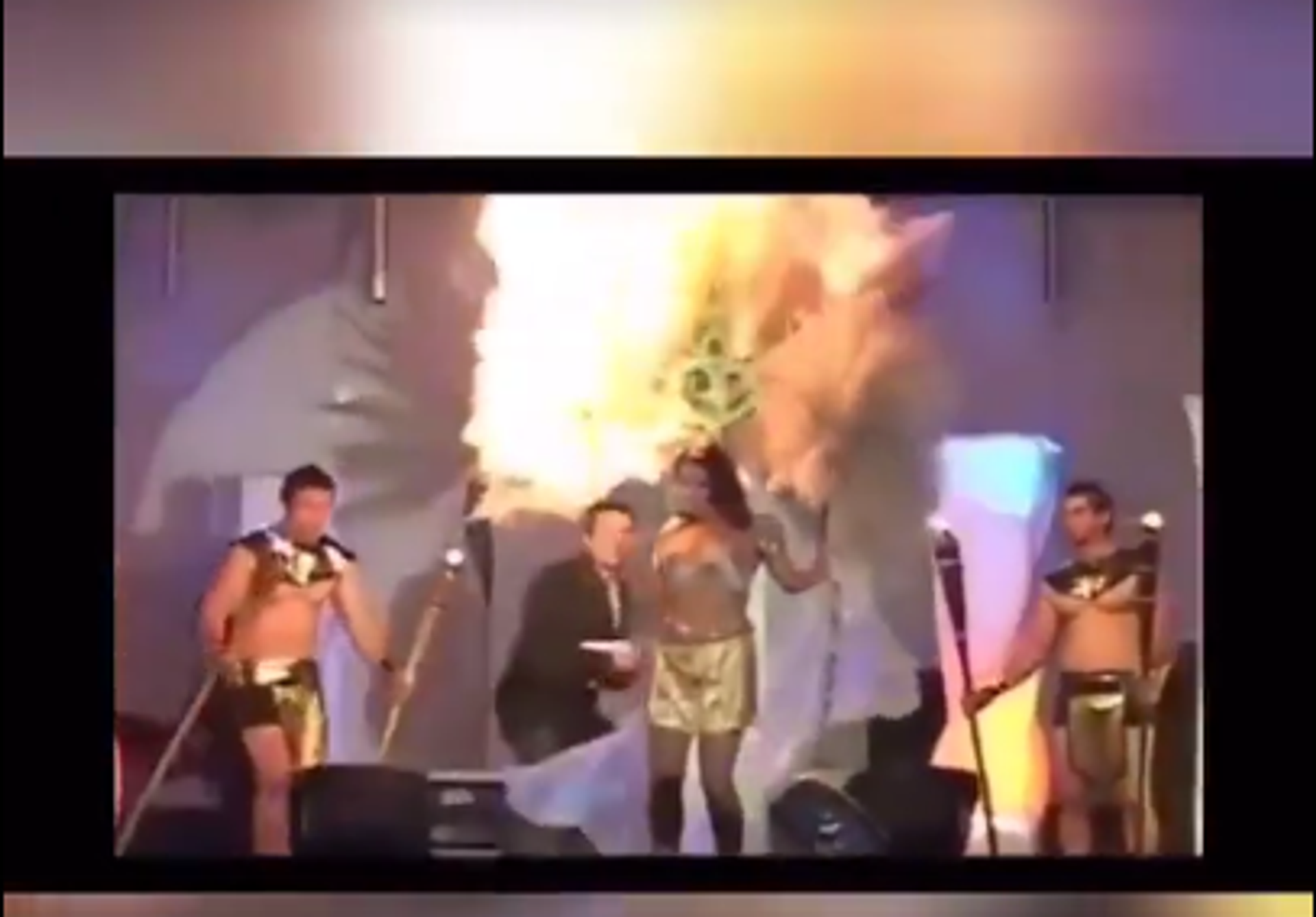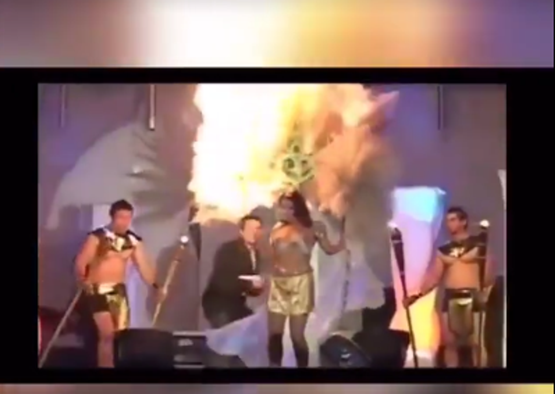 一位参赛者头戴华丽的、由许多羽毛装点成的头饰,扮成“丰收女神”走上舞台。正是这个女装上的细节部分碰到了龙套演员手持的火把而燃烧了起来。