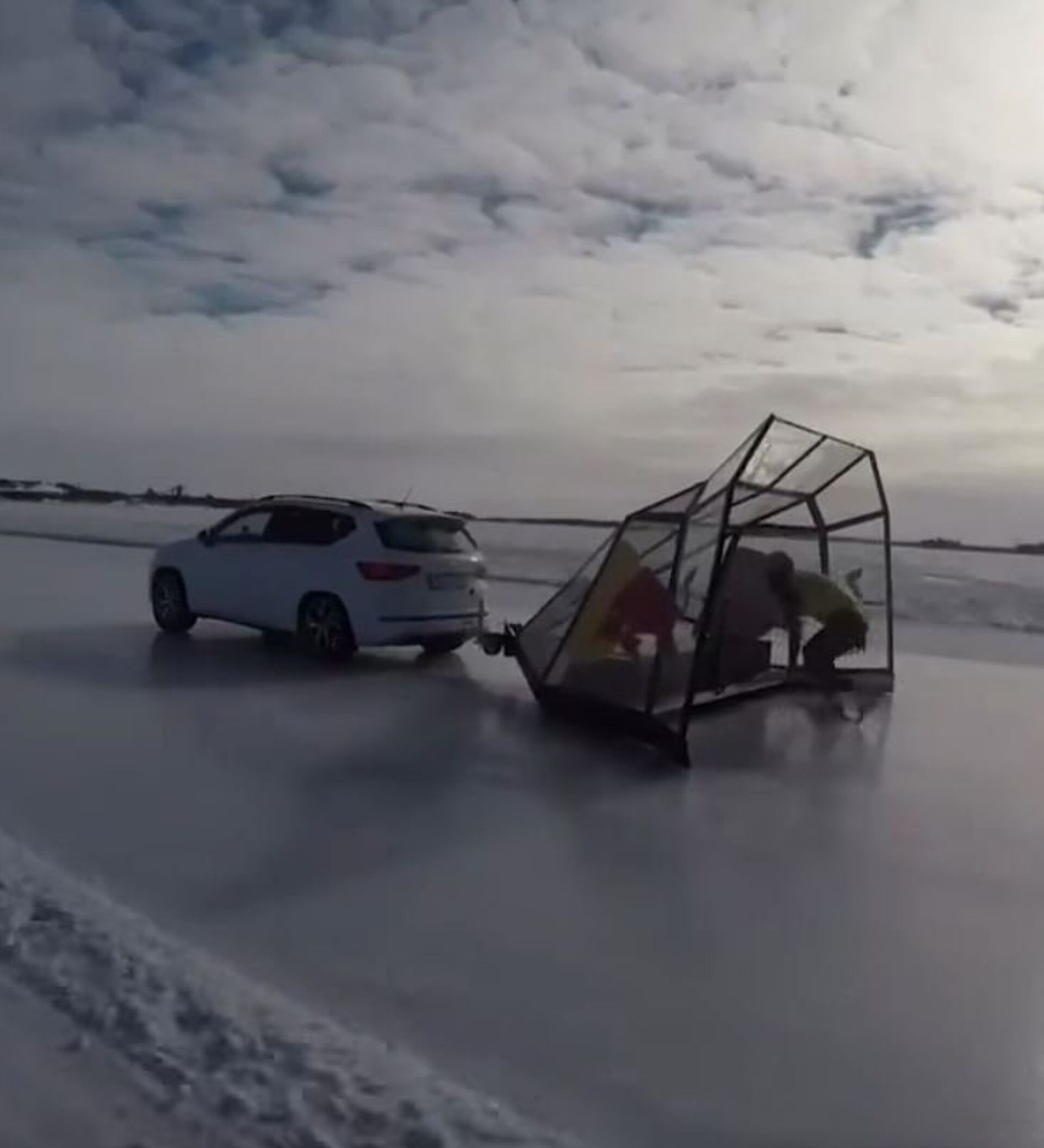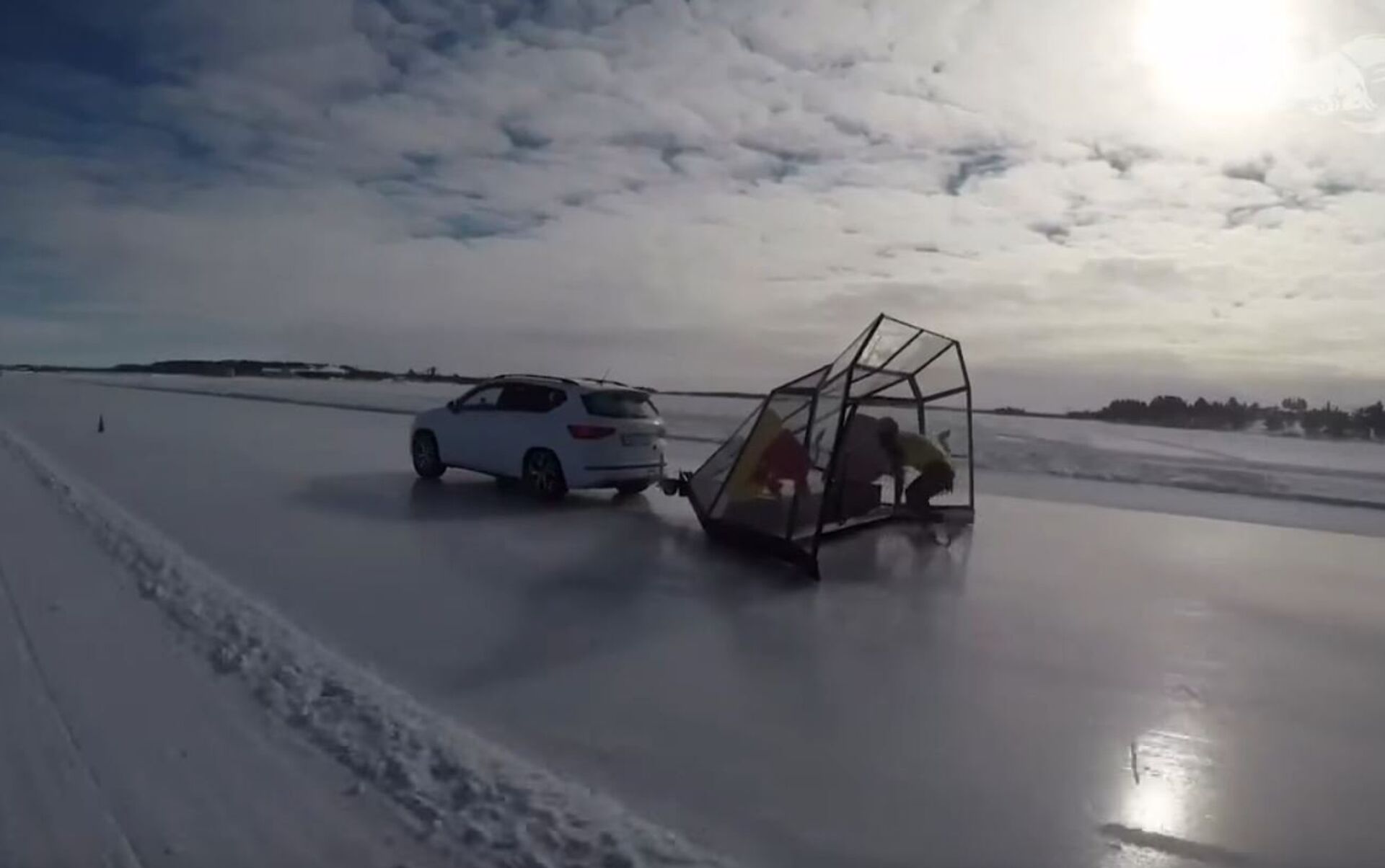 纽斯滑行前方有一台装配专门的挡风盾牌的汽车。