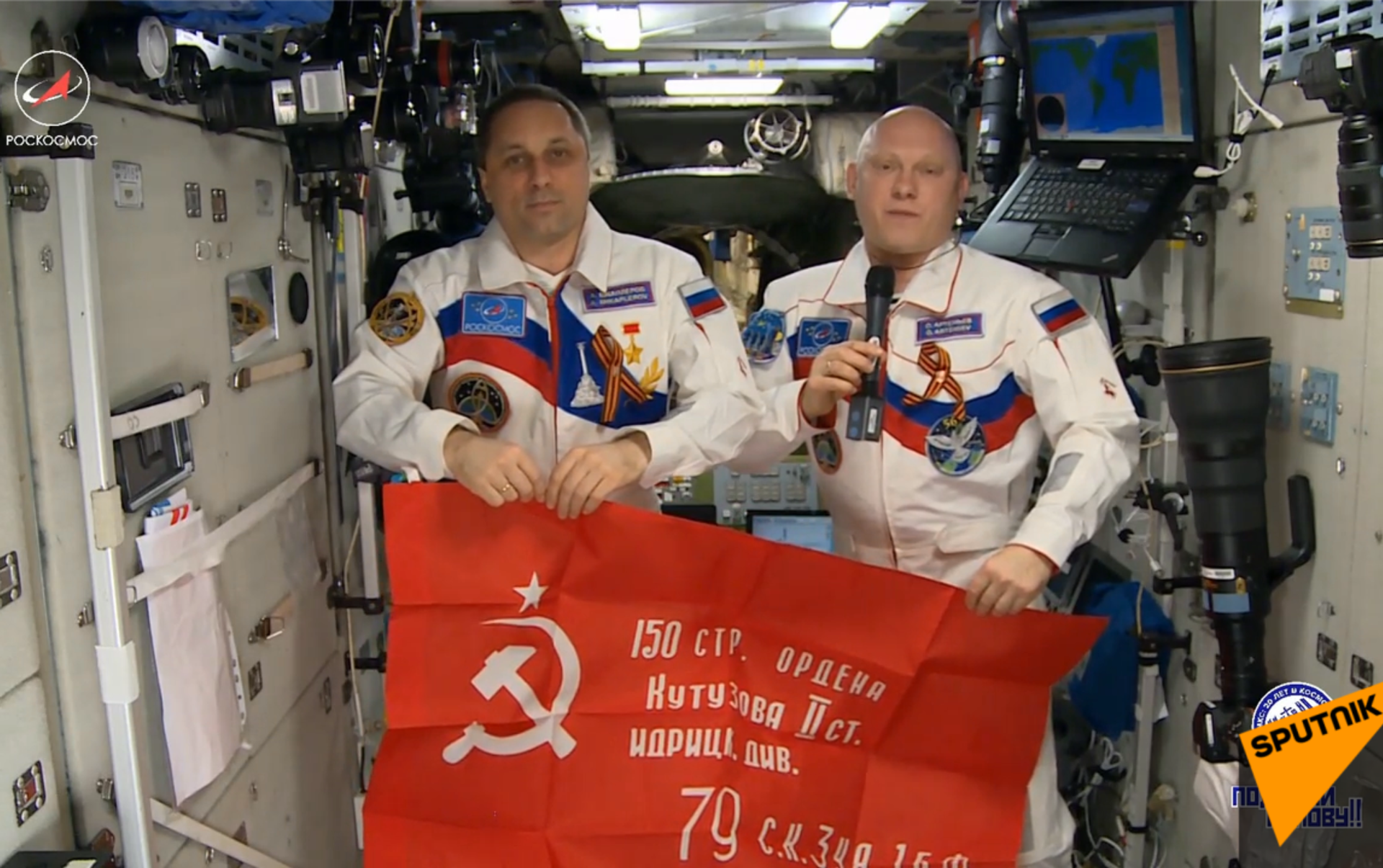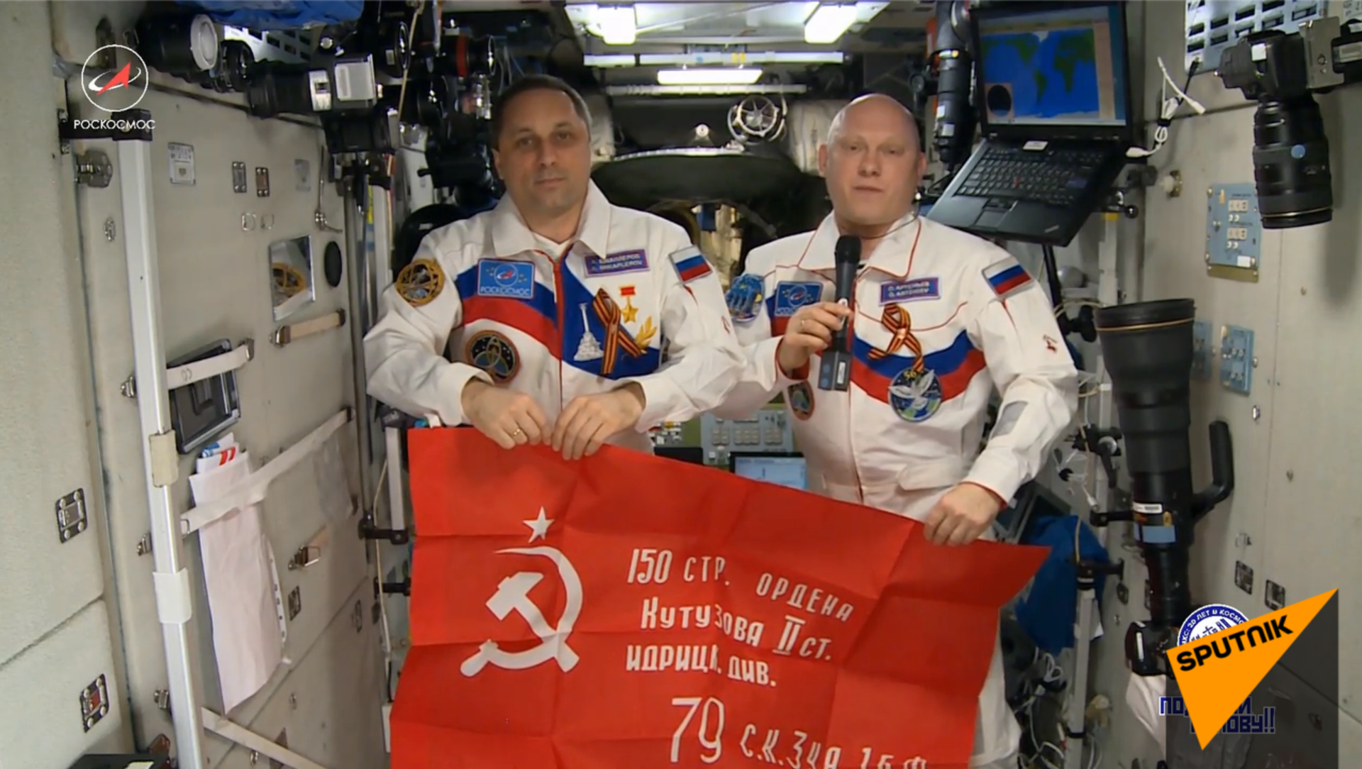 安东·什卡普列罗夫和随航工程师奥列格·阿尔捷米耶夫祝大家胜利日快乐! 2018年5月9日, 俄罗斯卫星通讯社