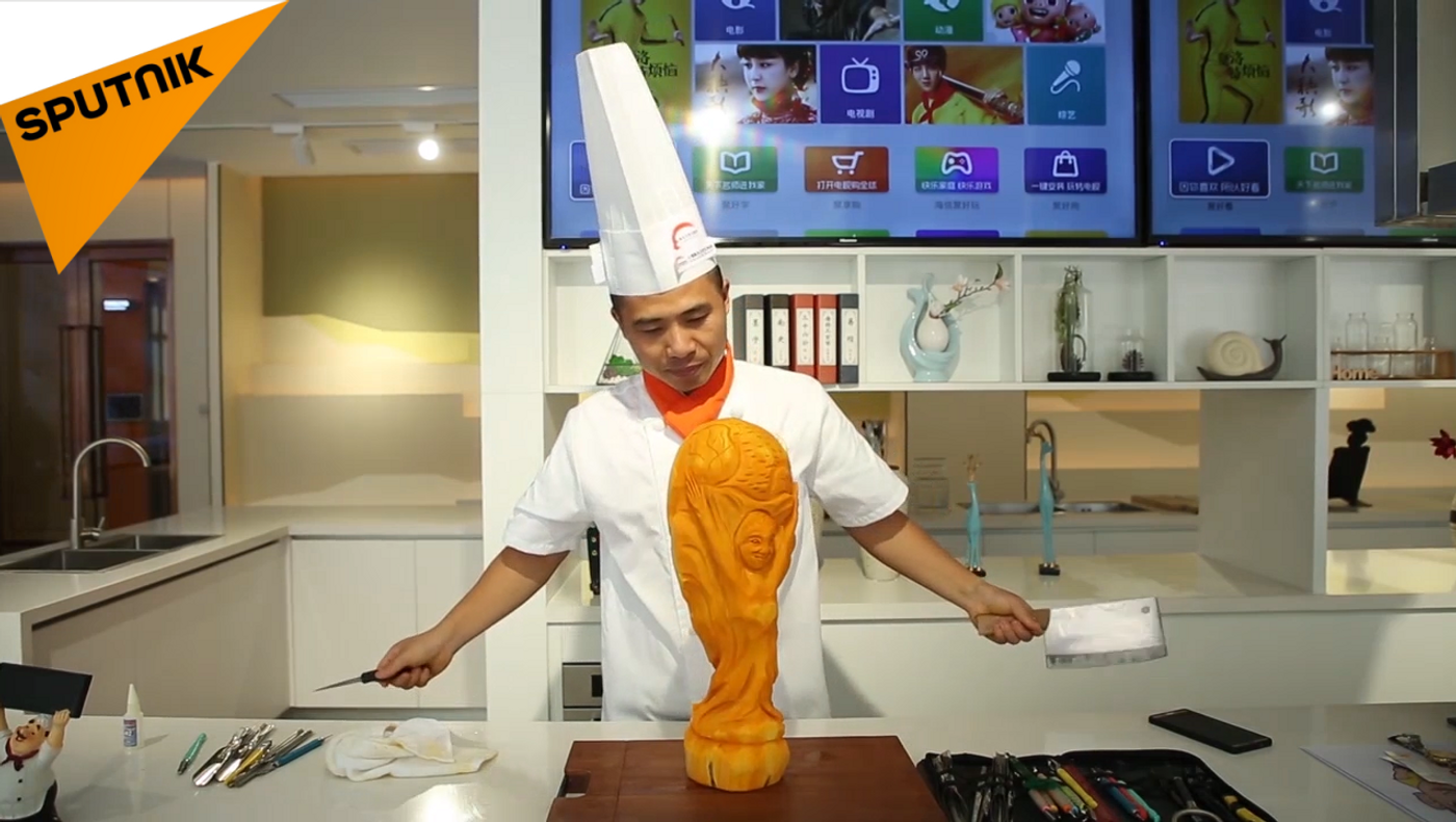 一名中国厨师用蜂蜜南瓜雕刻出大力神杯。 2018年7月14日, 俄罗斯卫星通讯社