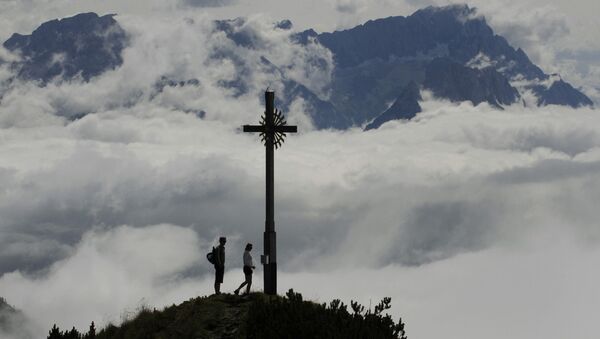 游客从德国温德尔斯坦山山巅俯瞰雾中的阿尔卑斯山山谷