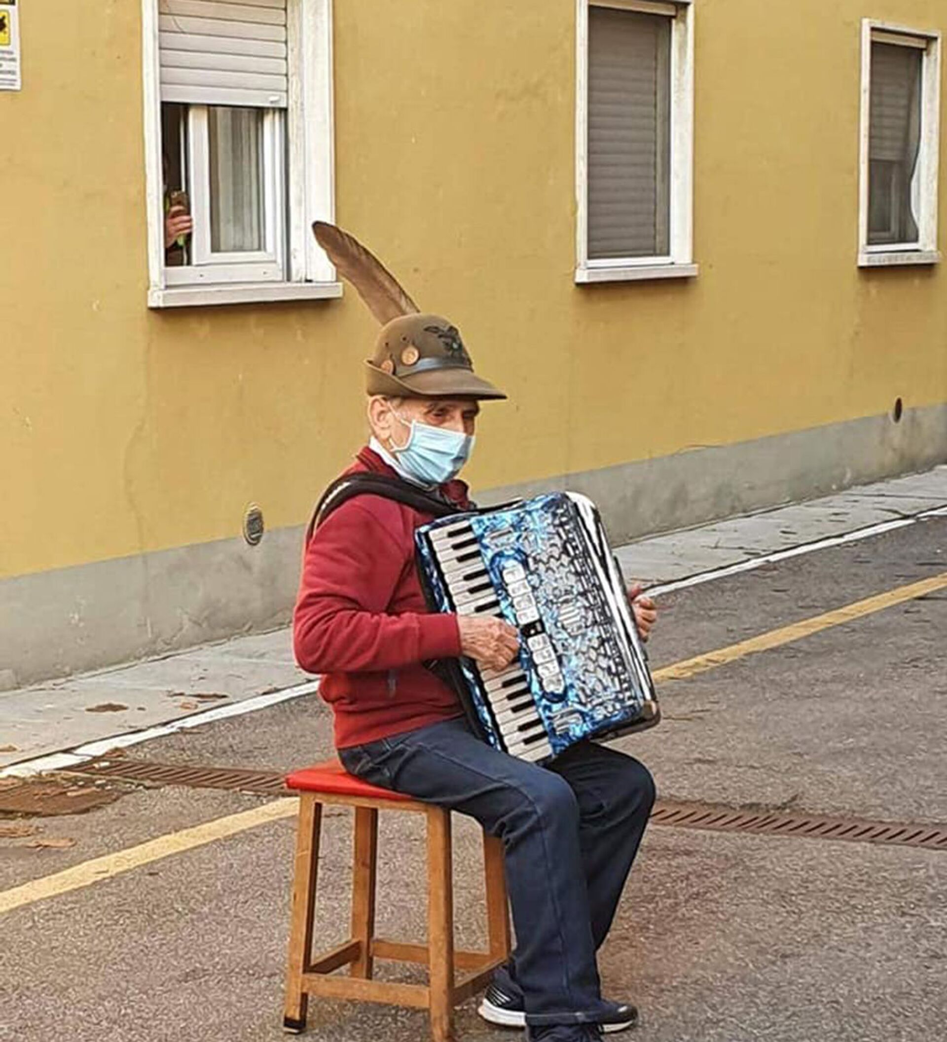老人坐在空荡街道的一张小椅子上,用手风琴演奏了几首情歌,包括妻子最爱的旋律。妻子和另两名女子观看了他的演奏,她们都戴着口罩。