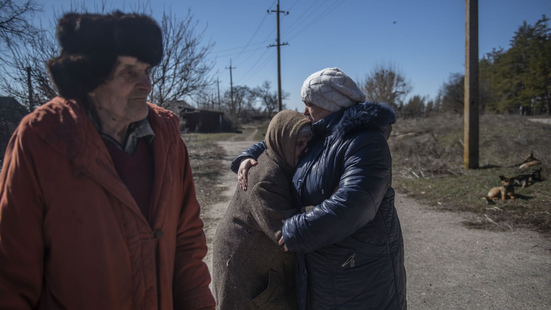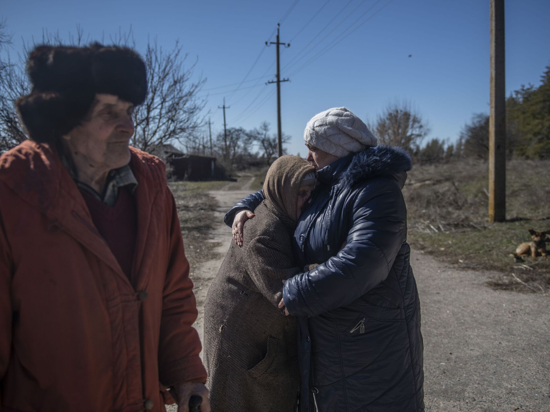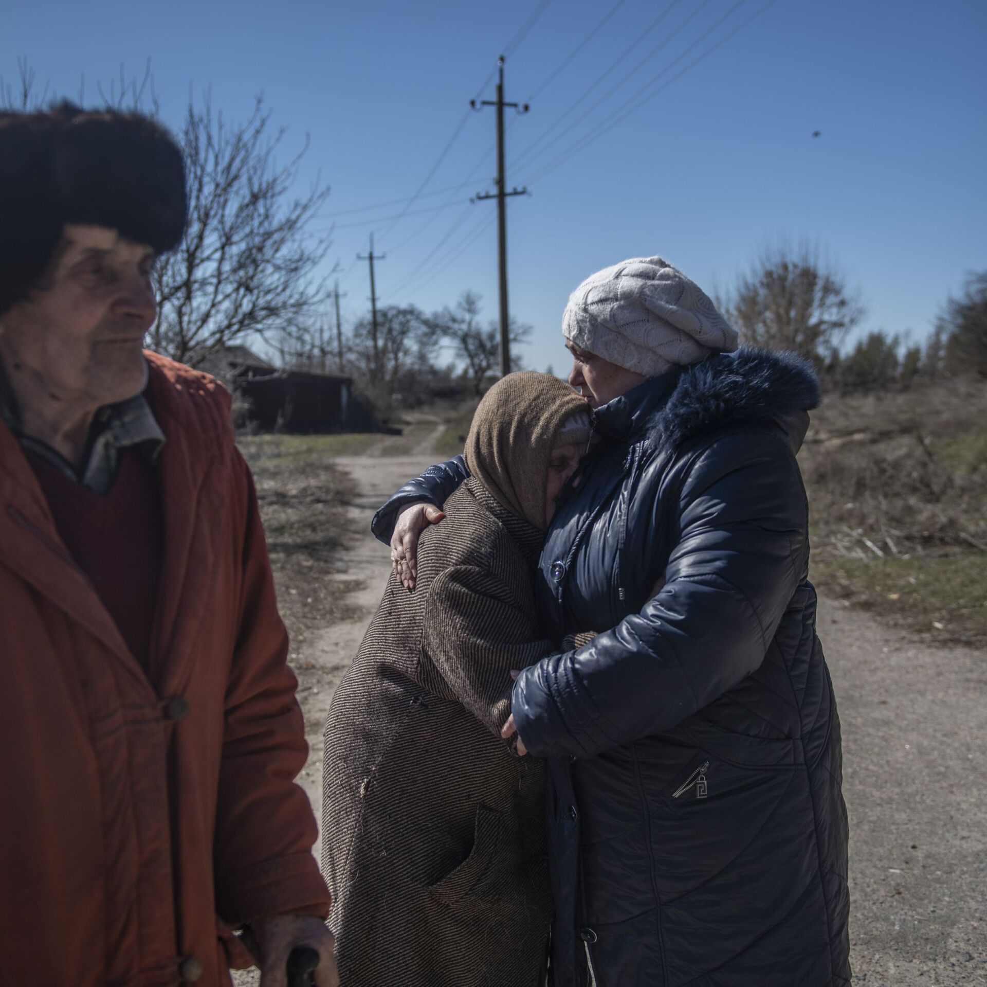 图为卢甘斯克民共和国博洛坚诺耶镇居民亚历山大·阿列克谢耶维奇(图左)与薇拉·阿法纳西耶夫娜·波尔克夫尼科娃(图右)与女儿塔季扬娜在镇口团聚。
