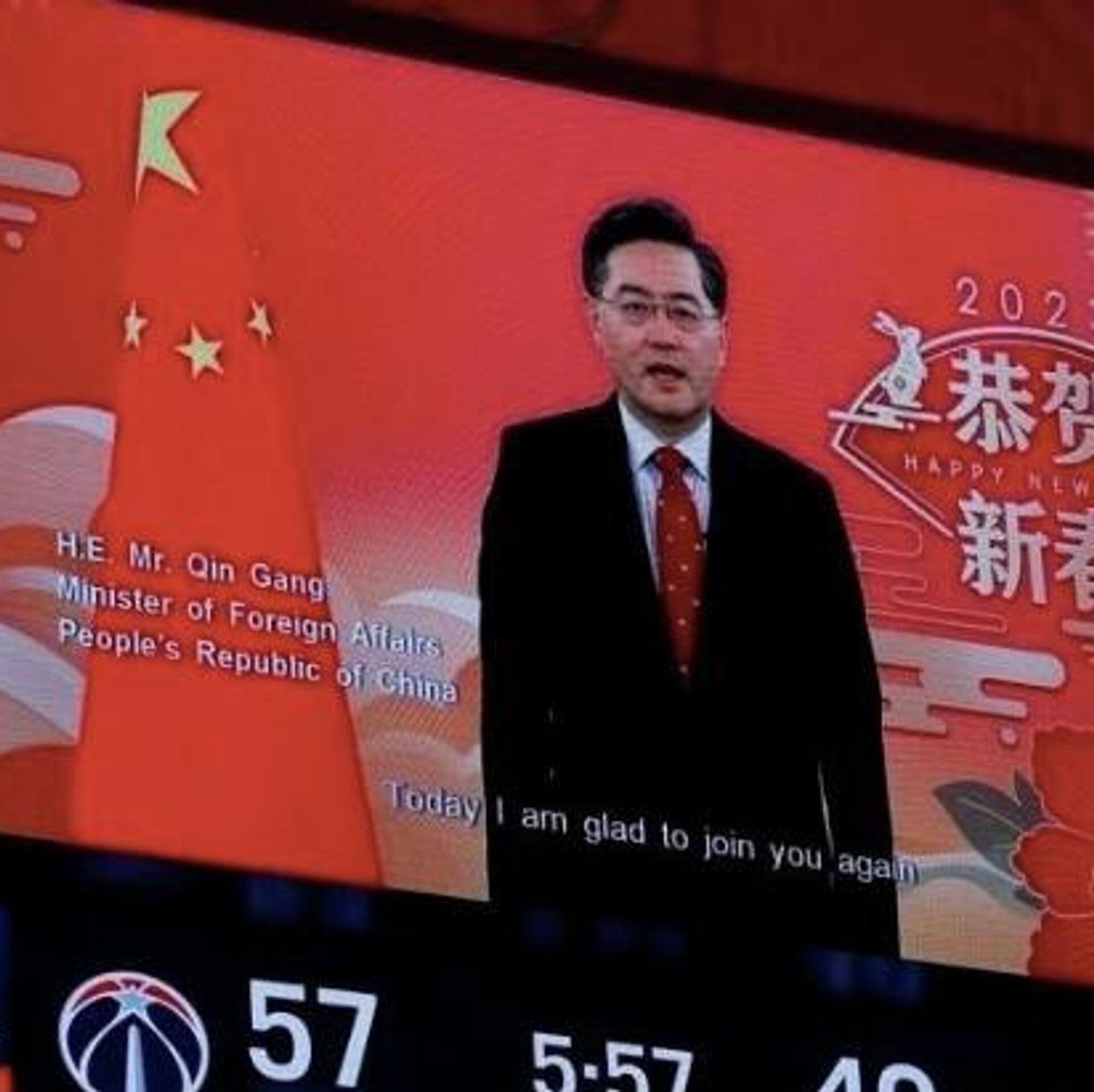 美国东部时间1月21日晚,中国新任外长秦刚在美国职业篮球联赛(NBA)华盛顿奇才队主场与奥兰多魔术队比赛期间发表视频致辞,向两支球队、NBA广大球迷和中美民众献上农历新年祝福。 2023年1月23日, 俄罗斯卫星通讯社