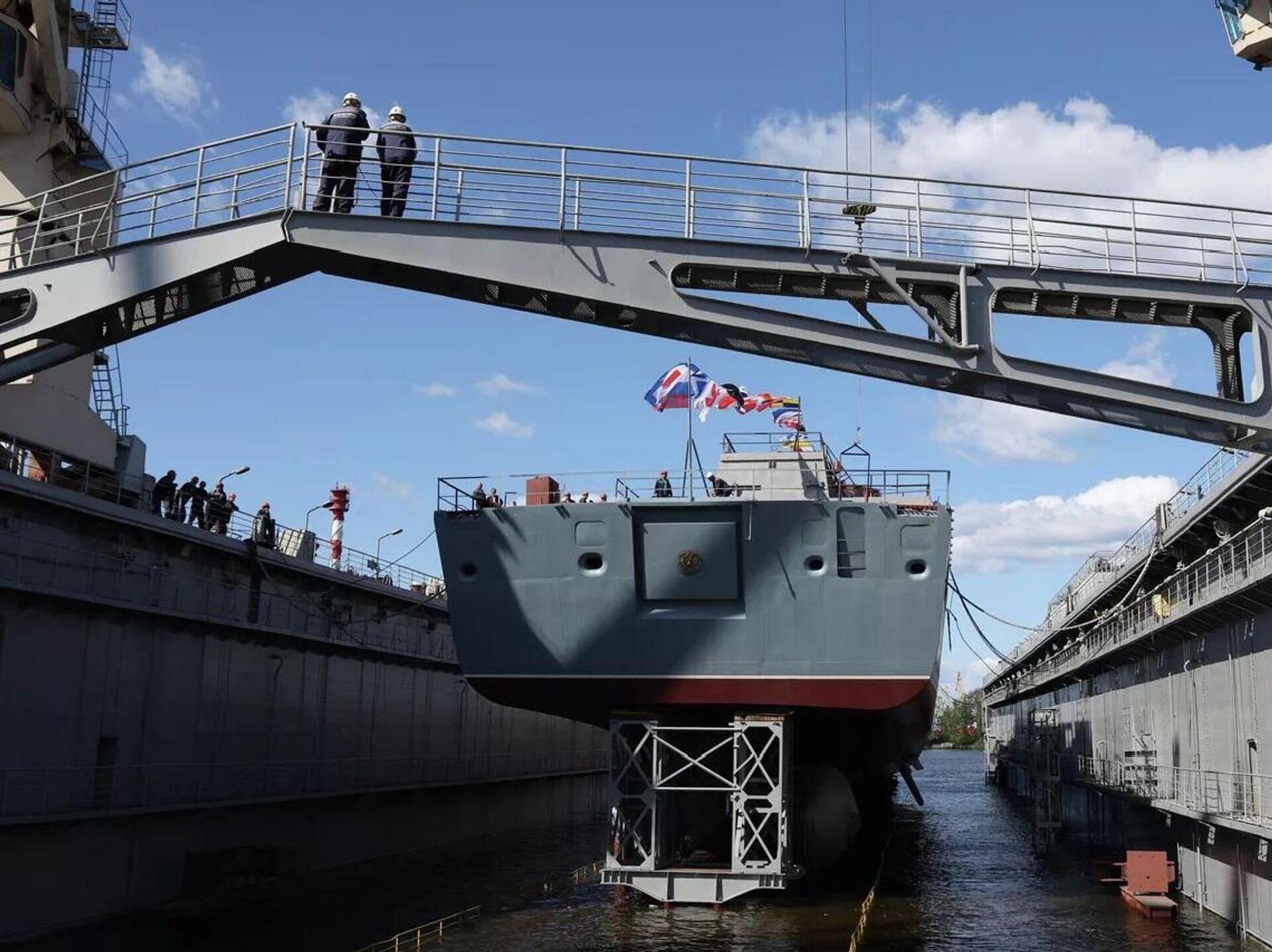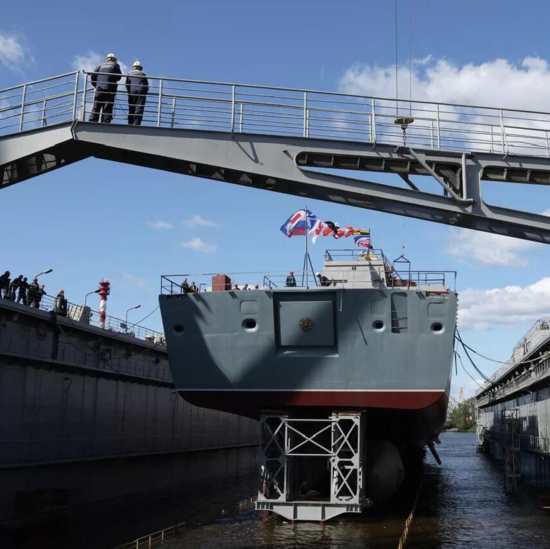 22350型“阿梅利科海军上将”号护卫舰在俄罗斯联合造船集团下属圣彼得堡北方造船厂下水。