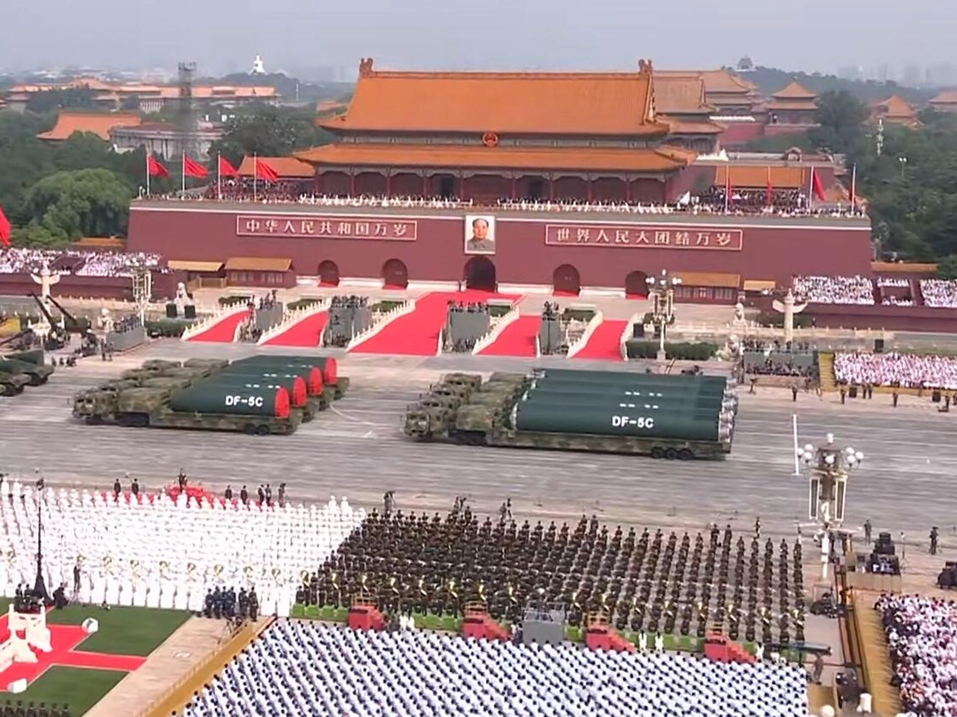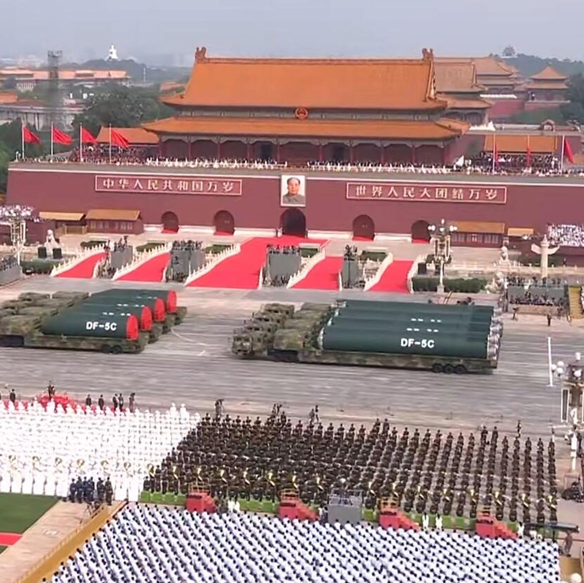 此次受阅的武器装备全部为国产现役主战装备,多数为首次亮相。“惊雷-1”空基远程导弹,“巨浪-3”潜射洲际导弹,“东风-61”陆基洲际导弹,“东风-31”新型陆基洲际导弹,首次集中展示陆、海、空基“三位一体”战略核力量。东风-5C液体洲际战略核导弹打击范围覆盖全球。
