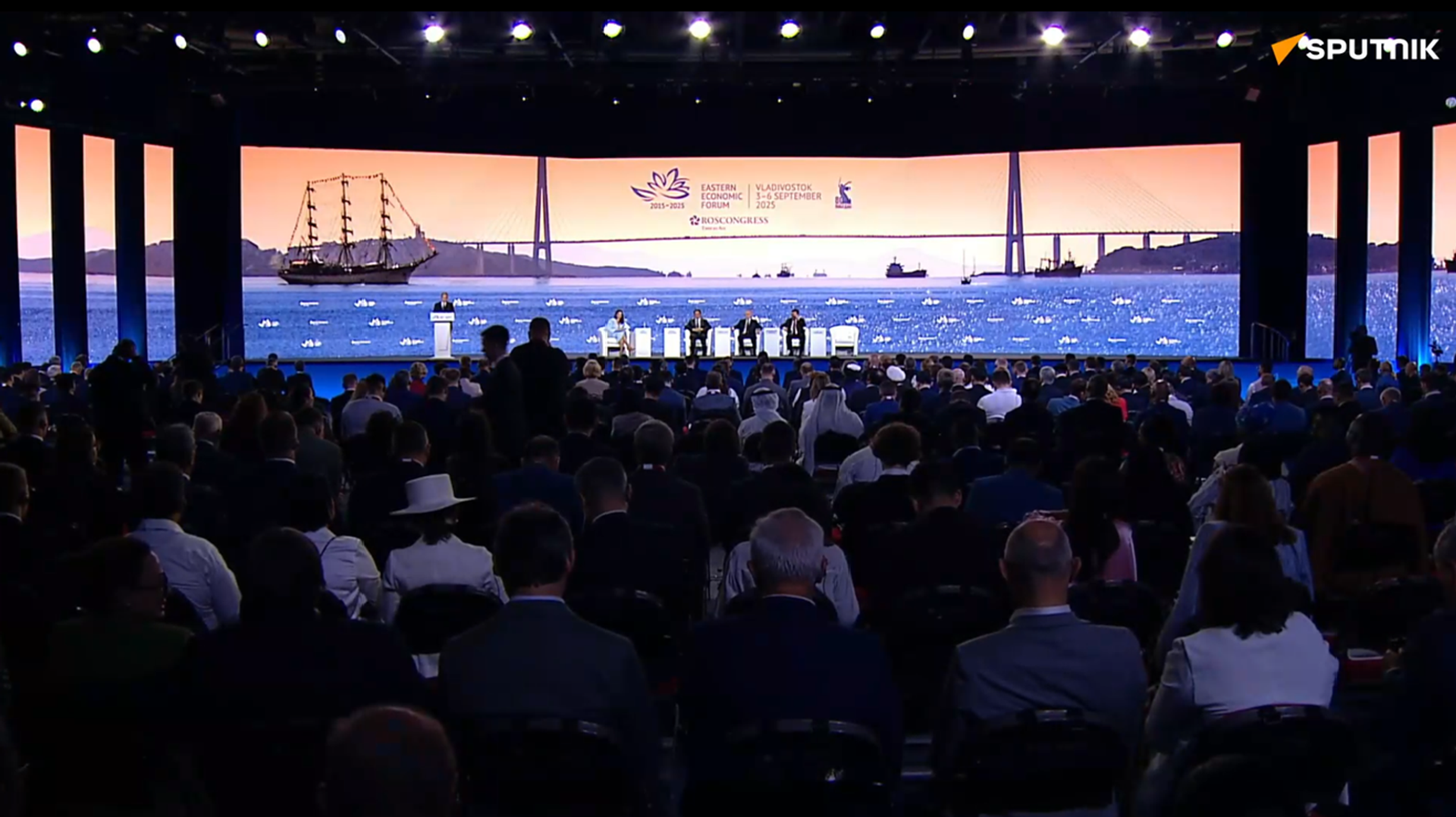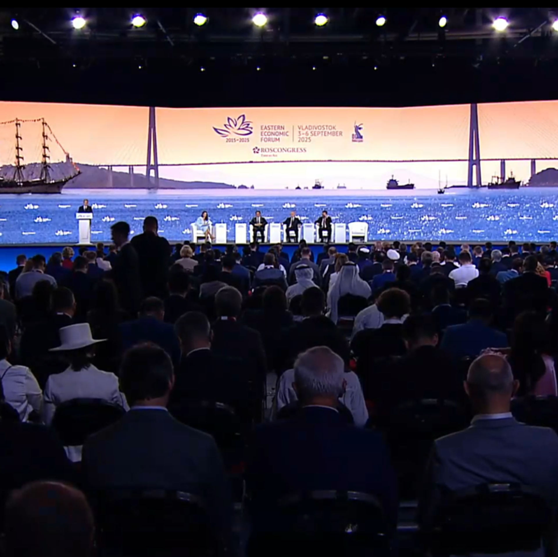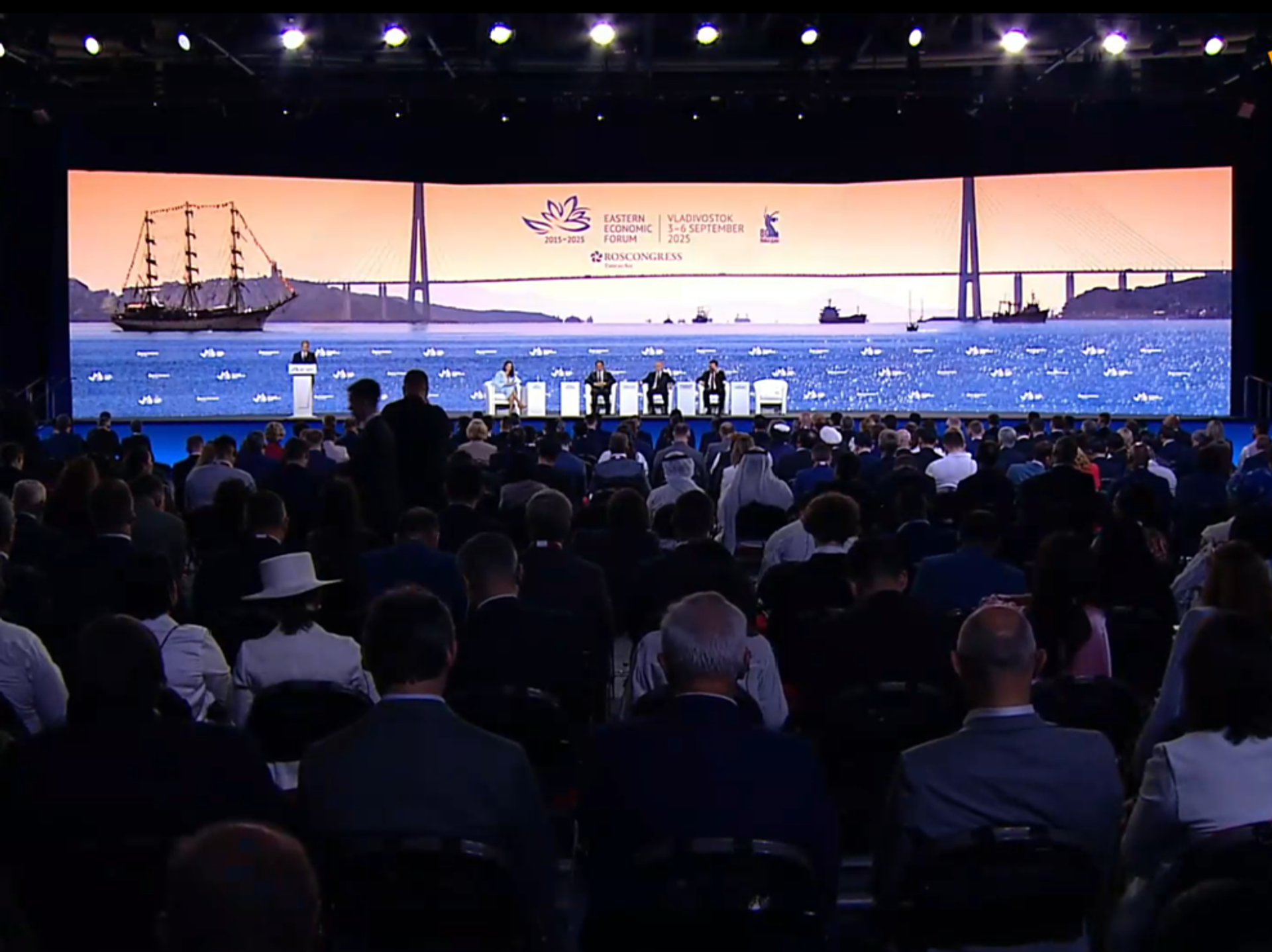 老挝总理宋赛·西潘敦、蒙古总理贡布扎布·赞丹沙塔尔以及中共中央政治局委员李鸿忠与普京共同出席东方经济论坛全体会议。