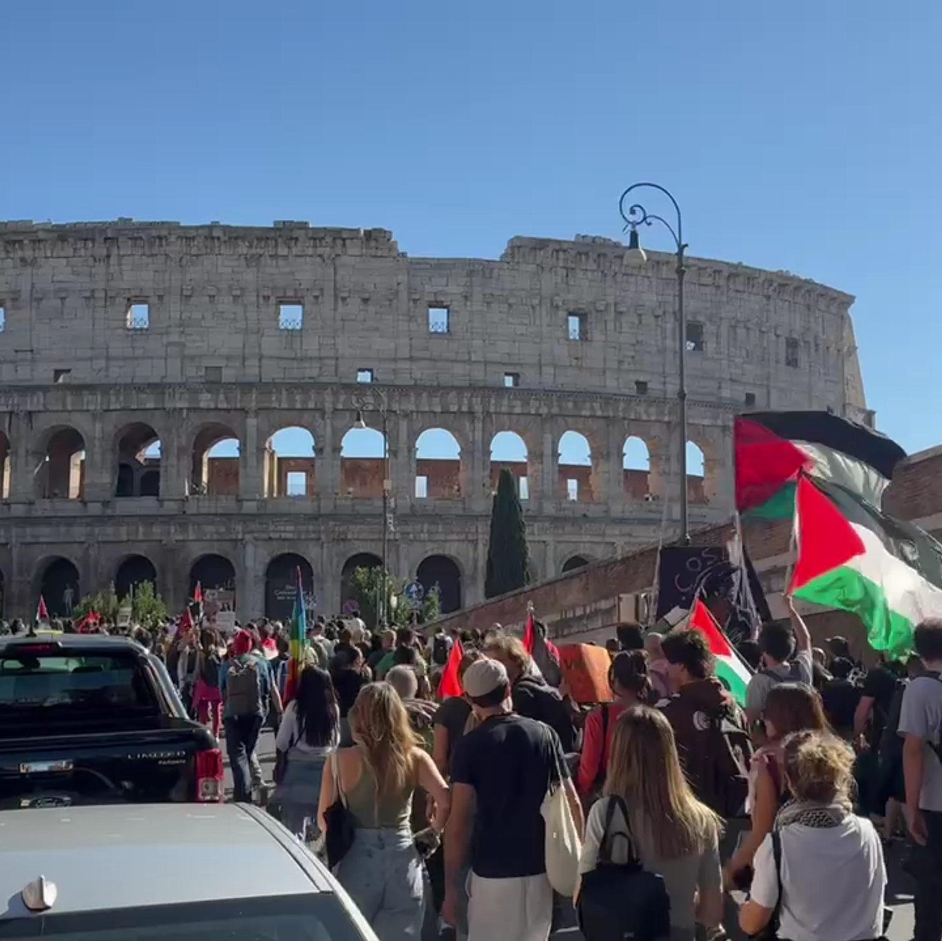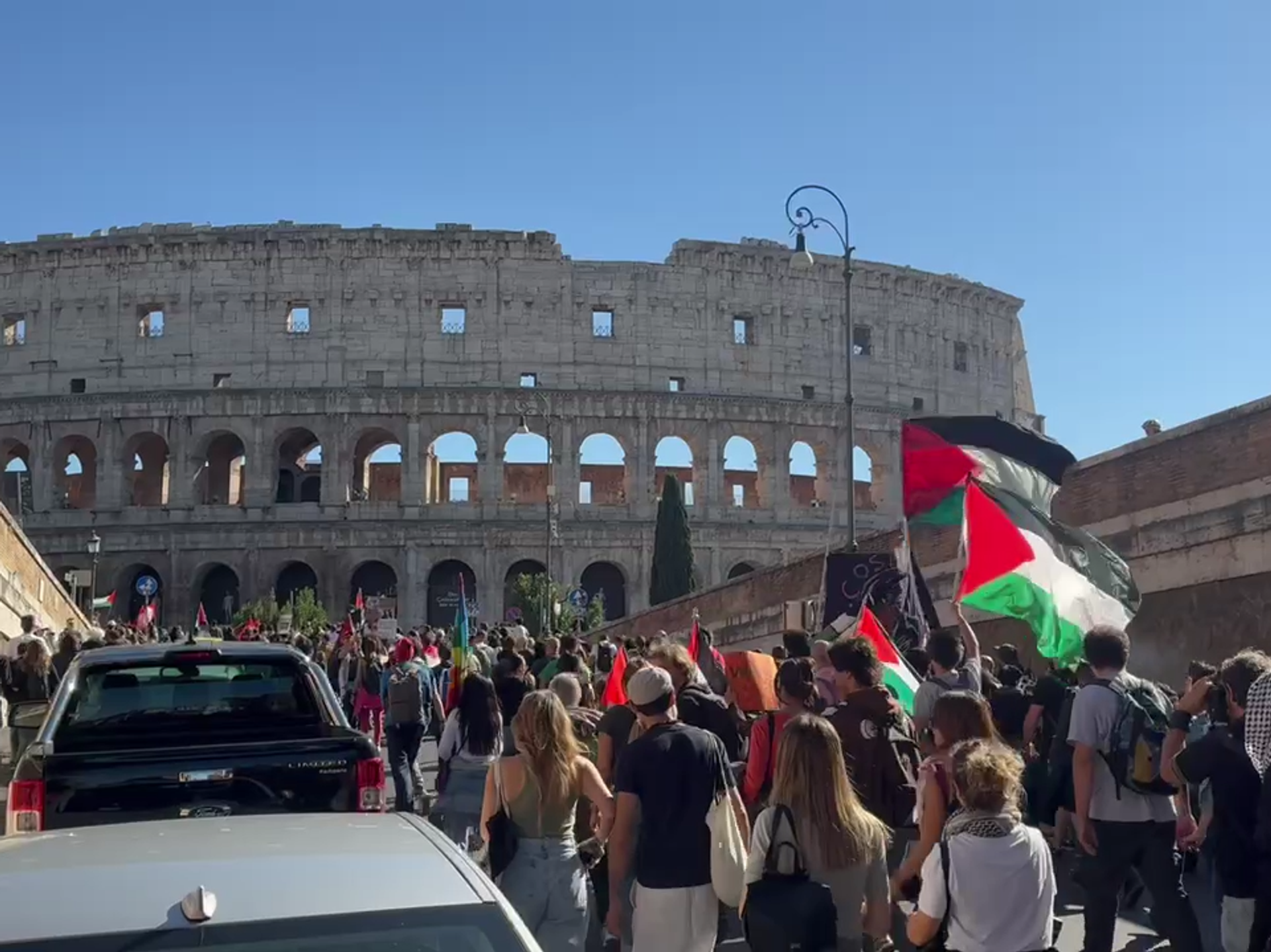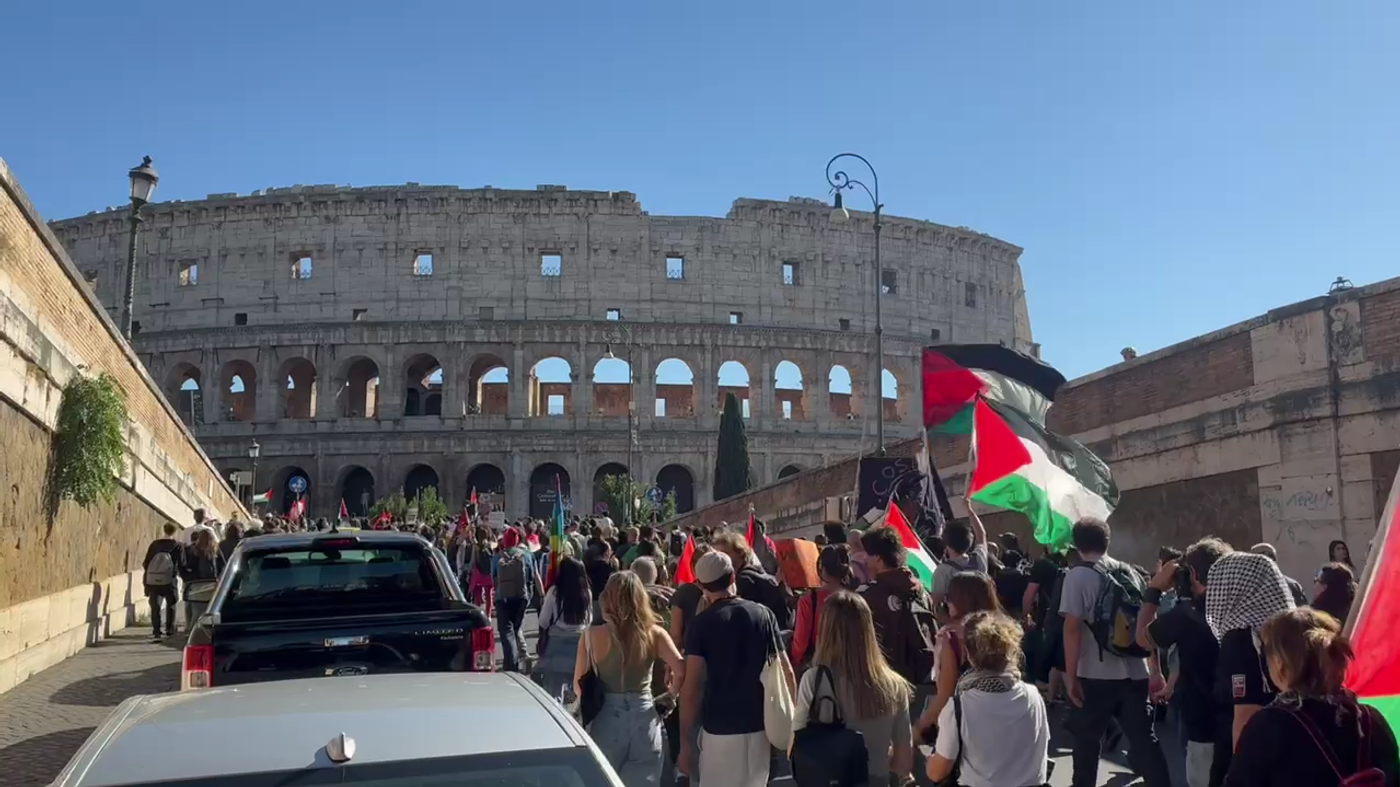 罗马发生数千人支持巴勒斯坦的游行,队伍延申两公里并途经斗兽场