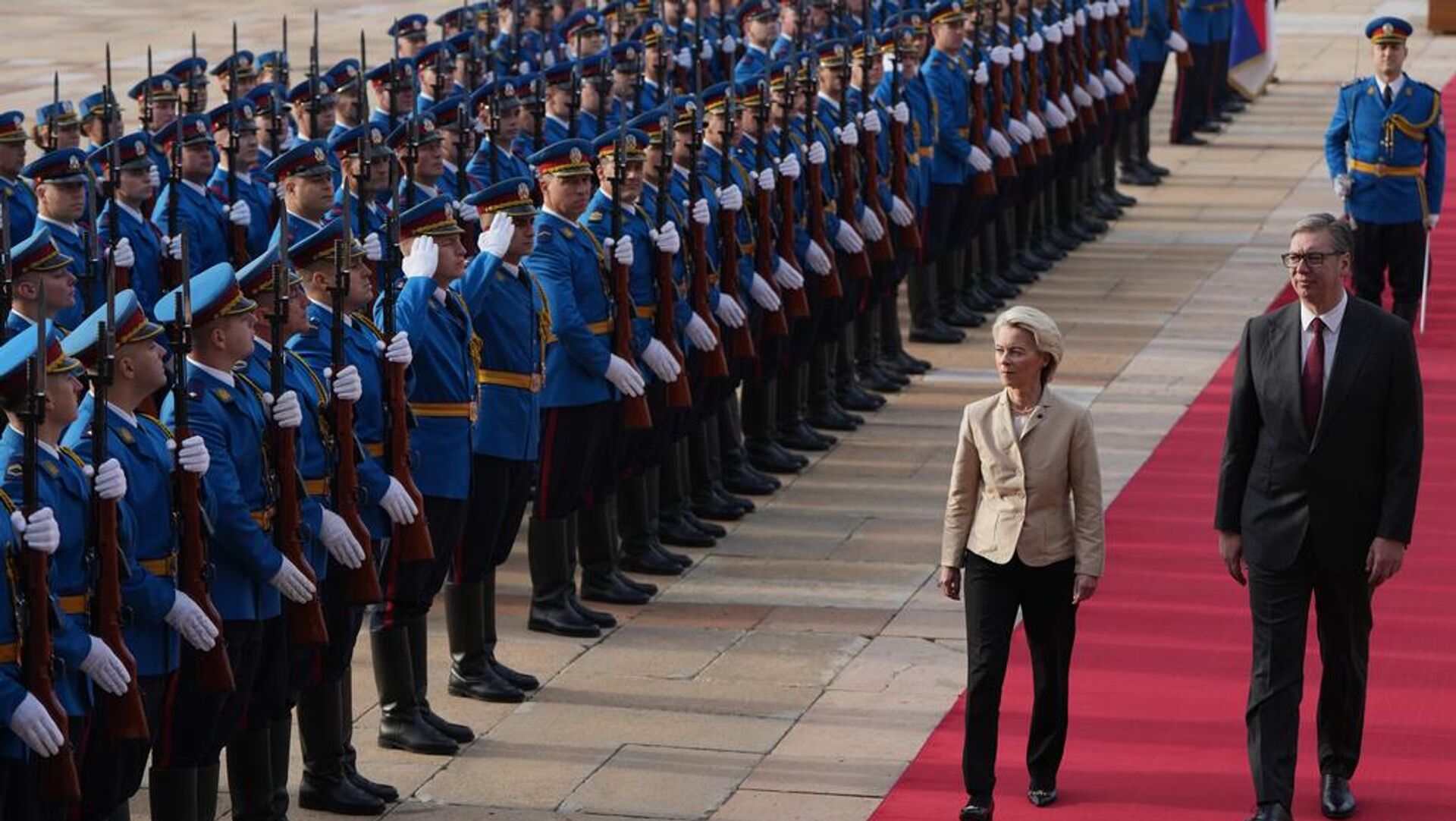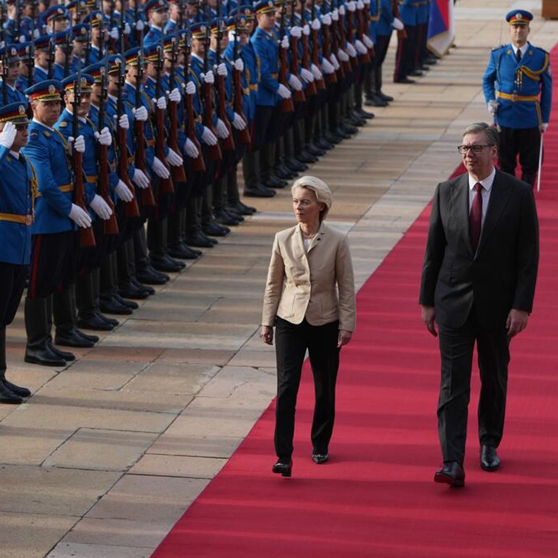 冯德莱恩正在对西巴尔干国家进行工作访问,她于10月14日晚抵达贝尔格莱德,塞尔维亚国家元首武契奇在尼古拉·特斯拉机场手捧鲜花迎接。15日,在塞尔维亚宫政府大楼前为其举行了欢迎仪式,军乐团演奏礼乐并鸣放礼炮。
