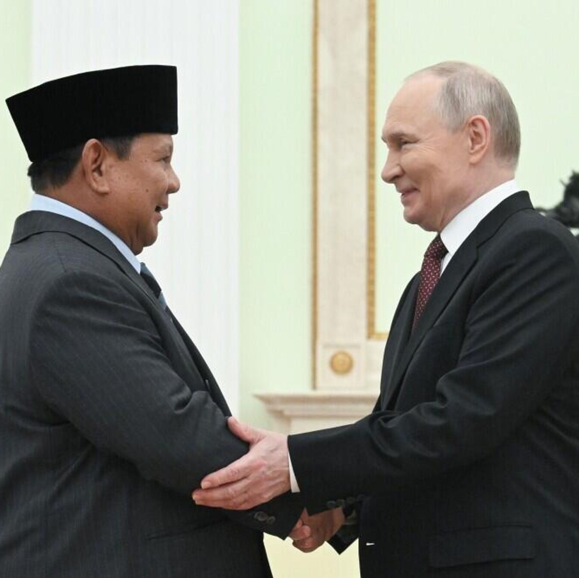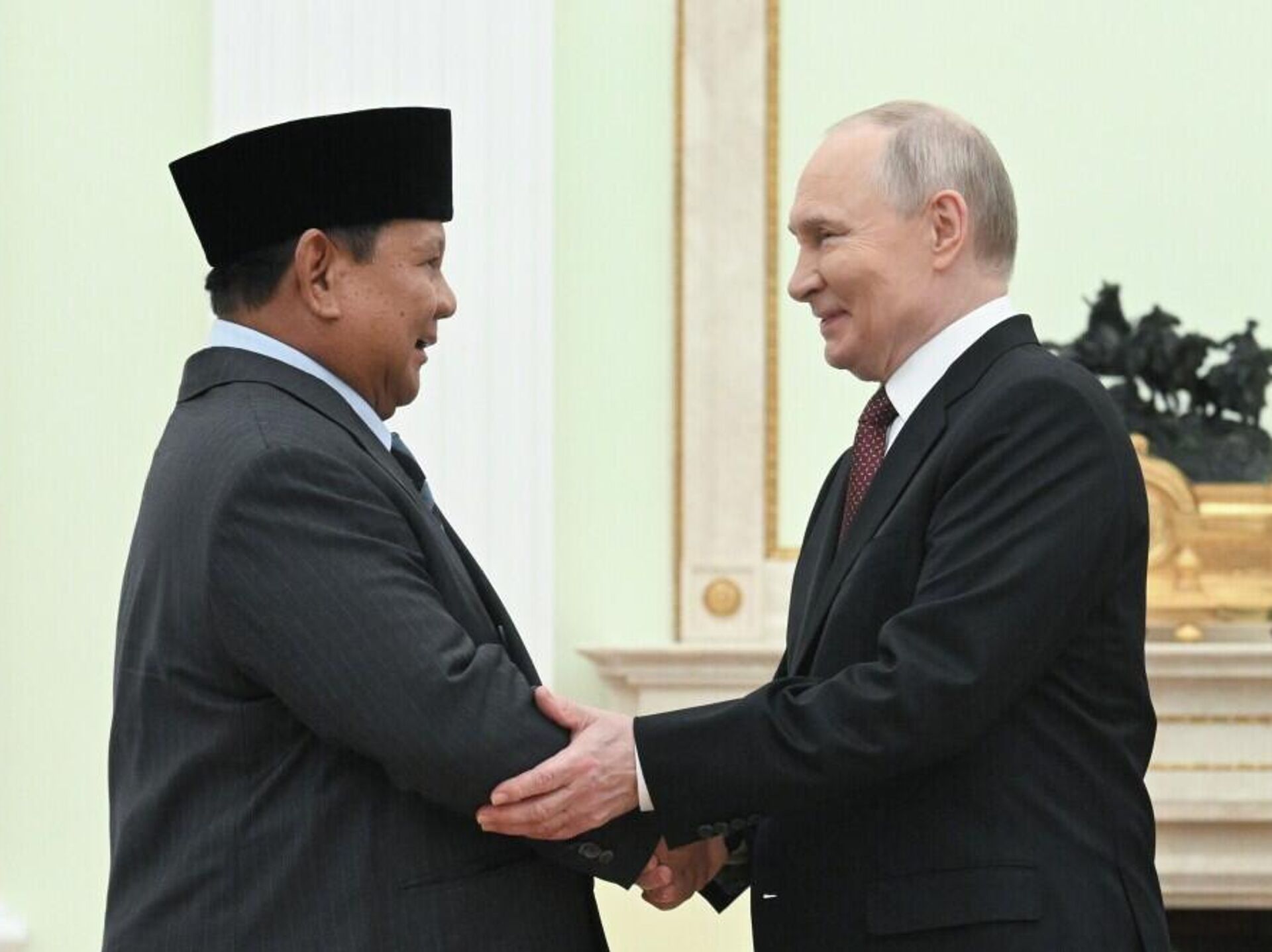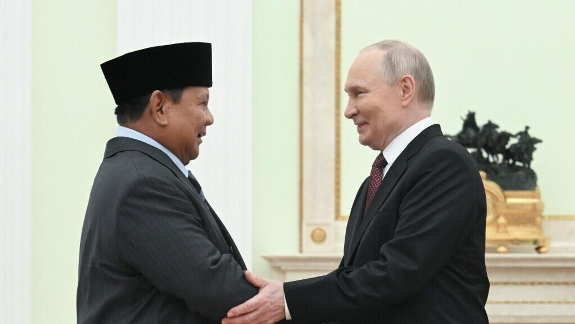 普京在会见印度尼西亚总统普拉博沃·苏比延多时说:“我们的关系,我还要再说一遍,在非常稳步地发展。今年我们共同庆祝了建交75周年。双方政府间委员会积极工作,经贸关系也以良好速度在发展,今年前九个月增长了17%。”