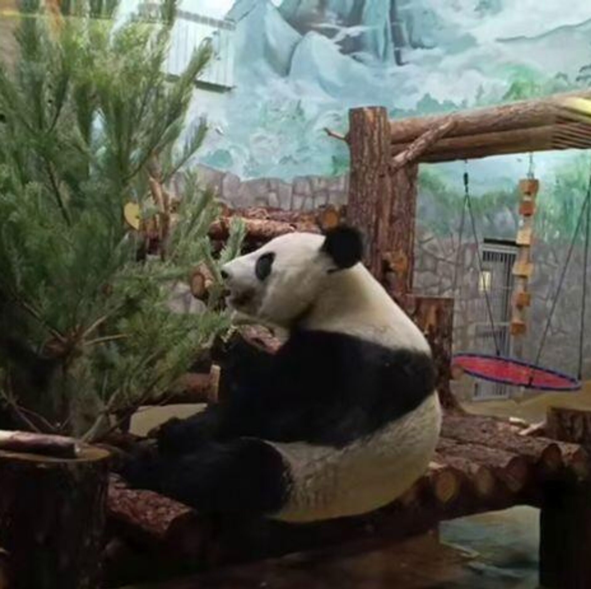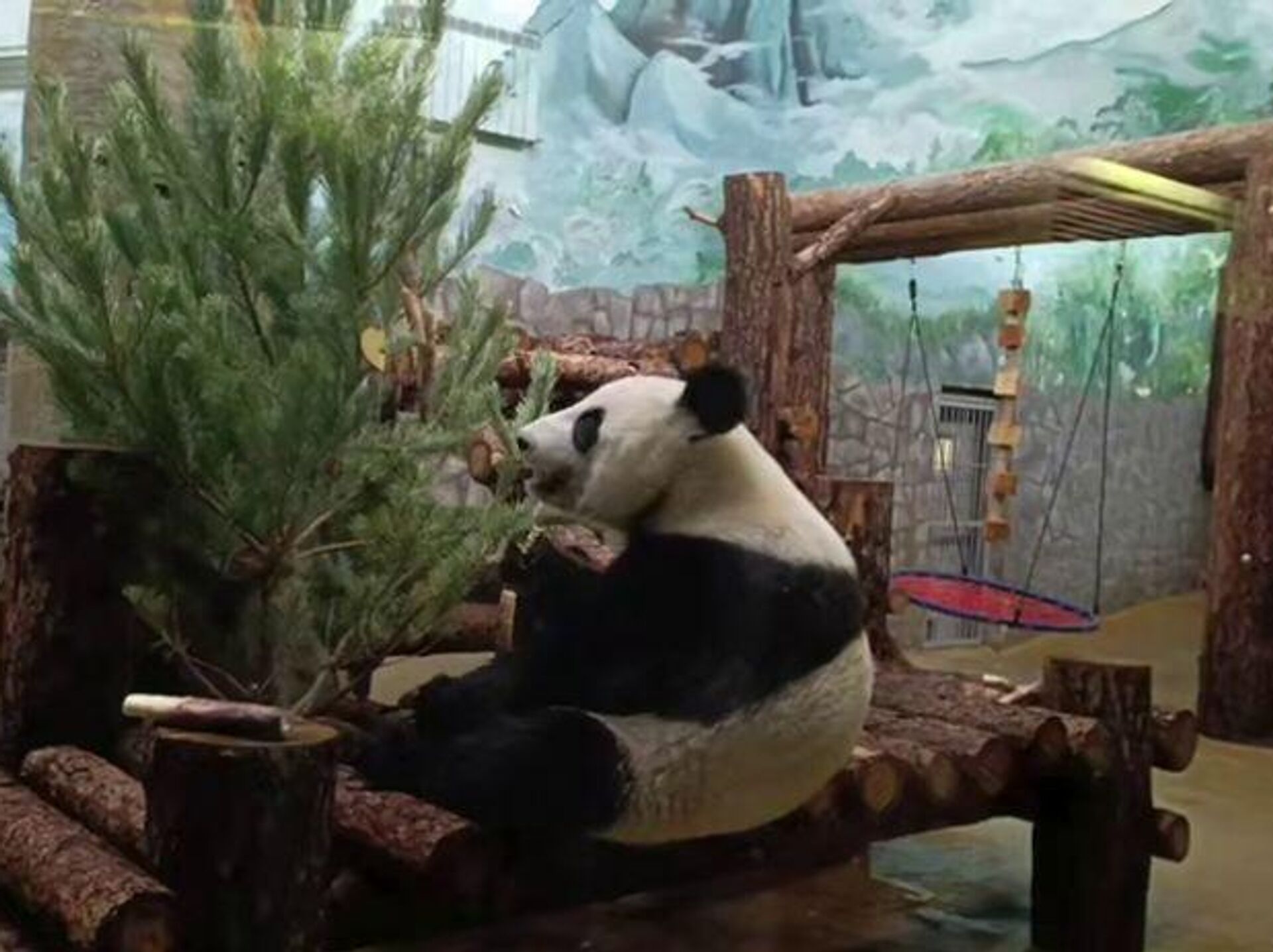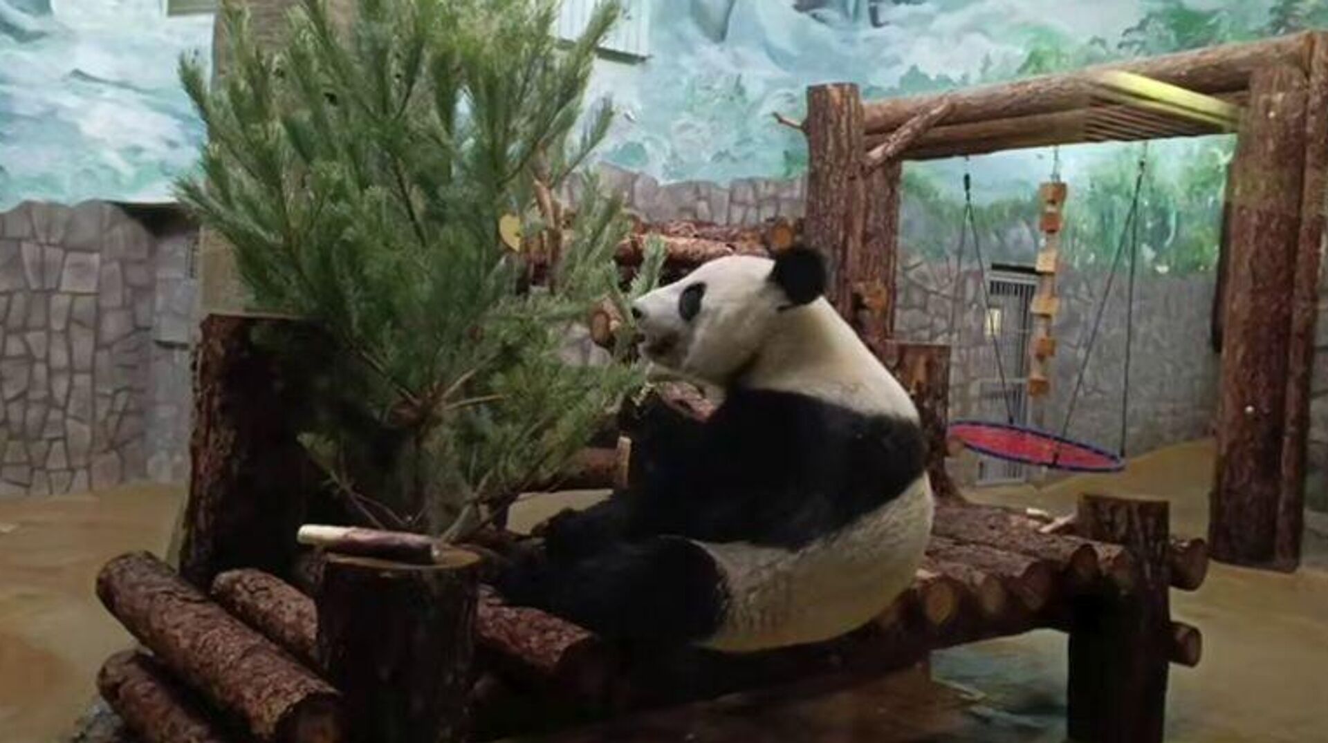 莫斯科动物园大熊猫“卡秋莎”收到一挂满零食松树作为礼物