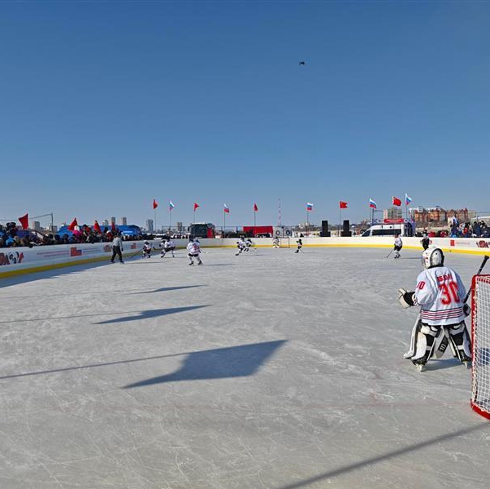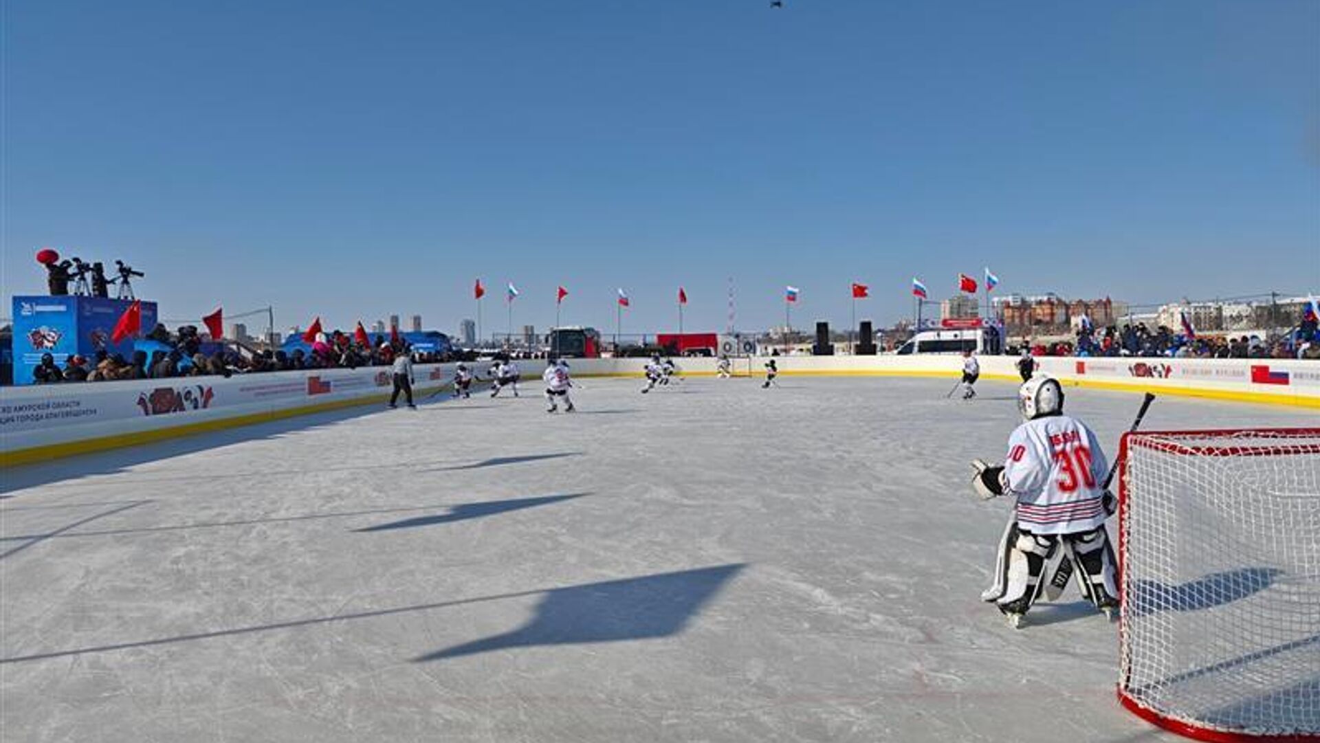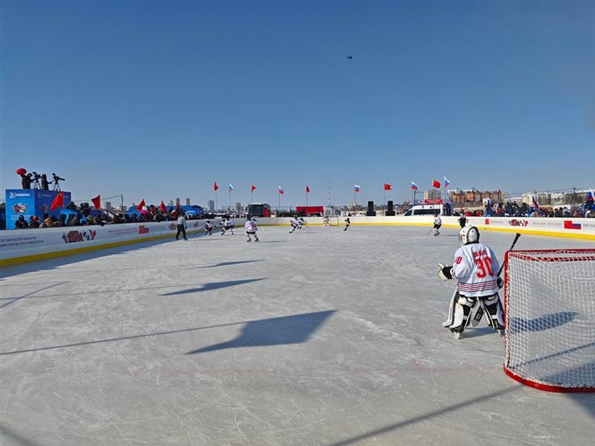 中俄界江黑龙江国际冰球友谊赛从2月28日持续至3月1日,运动员们在冰面上驰骋角逐。观众不仅可以领略精湛球技,还能在赛事间隙欣赏两国艺术家联袂献上的文艺表演。