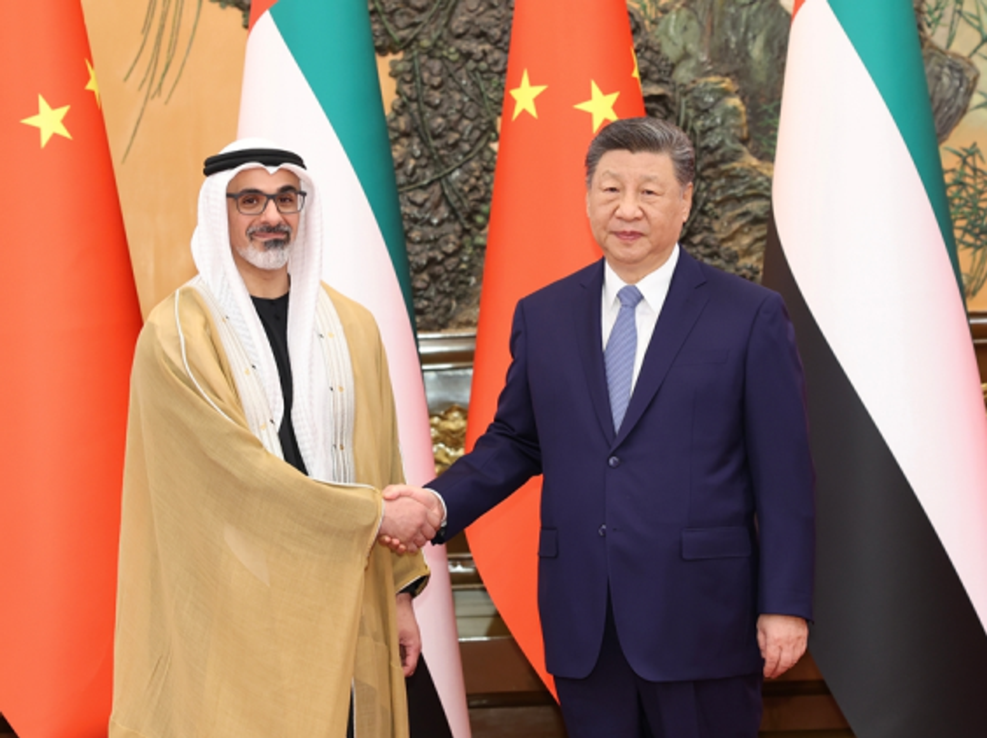 习近平指出,阿联酋是中国的全面战略伙伴,中方始终高度重视发展同阿联酋的关系。在双方共同努力下,中阿关系保持健康稳定发展,政治互信不断加深,务实合作稳步推进,人文交流丰富多彩。巩固和提升中阿关系是双方的坚定共识,符合两国人民期待。中方愿同阿方携手同行,打造更加稳固坚韧、富有活力的中阿全面战略伙伴关系。双方要继续在涉及彼此核心利益和重大关切问题上相互支持,保持高层交往,筑牢战略互信。加强发展战略对接,在能源、投资、贸易、科技等领域深挖潜力,深化互利合作。推动教育、民航、旅游等合作取得更大进展,密切人文交流,夯实民意基础。在联合国、金砖国家等多边平台增进协调合作,以中阿关系的稳定性应对国际和地区形势的不确定性,共同推动构建人类命运共同体。哈立德表示,阿中关系历史悠久、根基深厚,两国始终相互尊重、相互信任,有着广泛共同利益。阿方高度重视发展对华关系,愿同中方落实好两国元首达成的重要共识,深化各领域合作,为两国关系开辟更广阔前景,造福两国人民。阿方赞赏中国在国际事务中发挥负责任和建设性作用,为政治解决当前中东危机作出积极努力。阿方致力于同中方保持密切沟通协调,促进相关方面停火止战,尽快恢复地区和平稳定,维护国际航运安全,防止对全球经济和能源安全造成更大影响。阿方将切实保护在阿中国公民和机构安全。