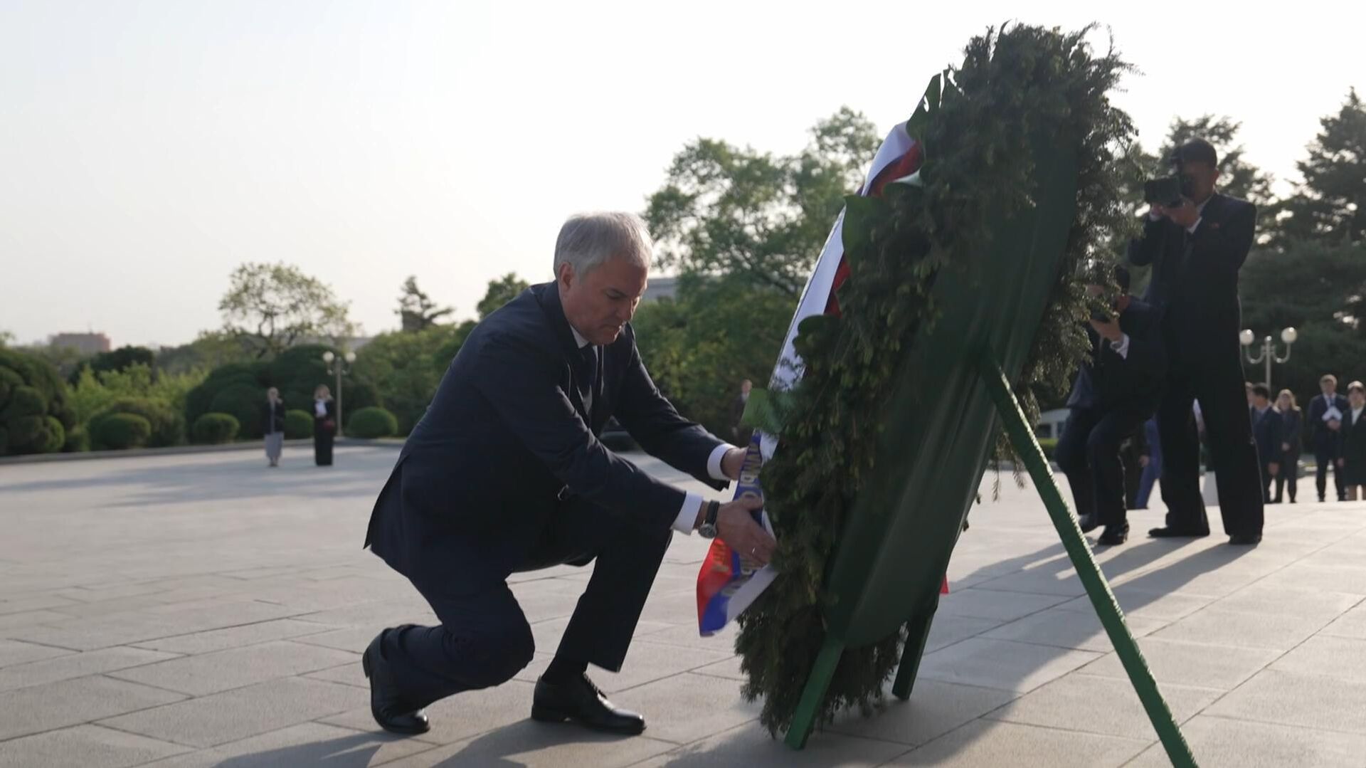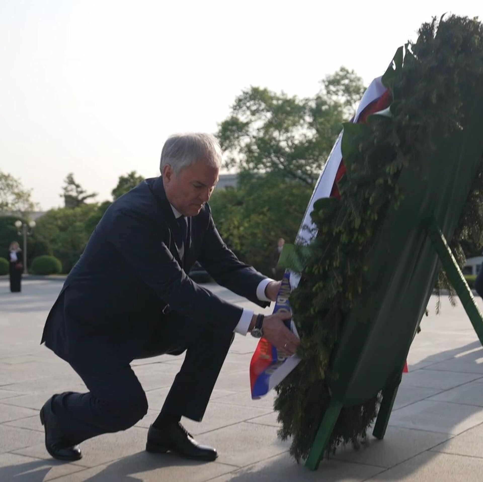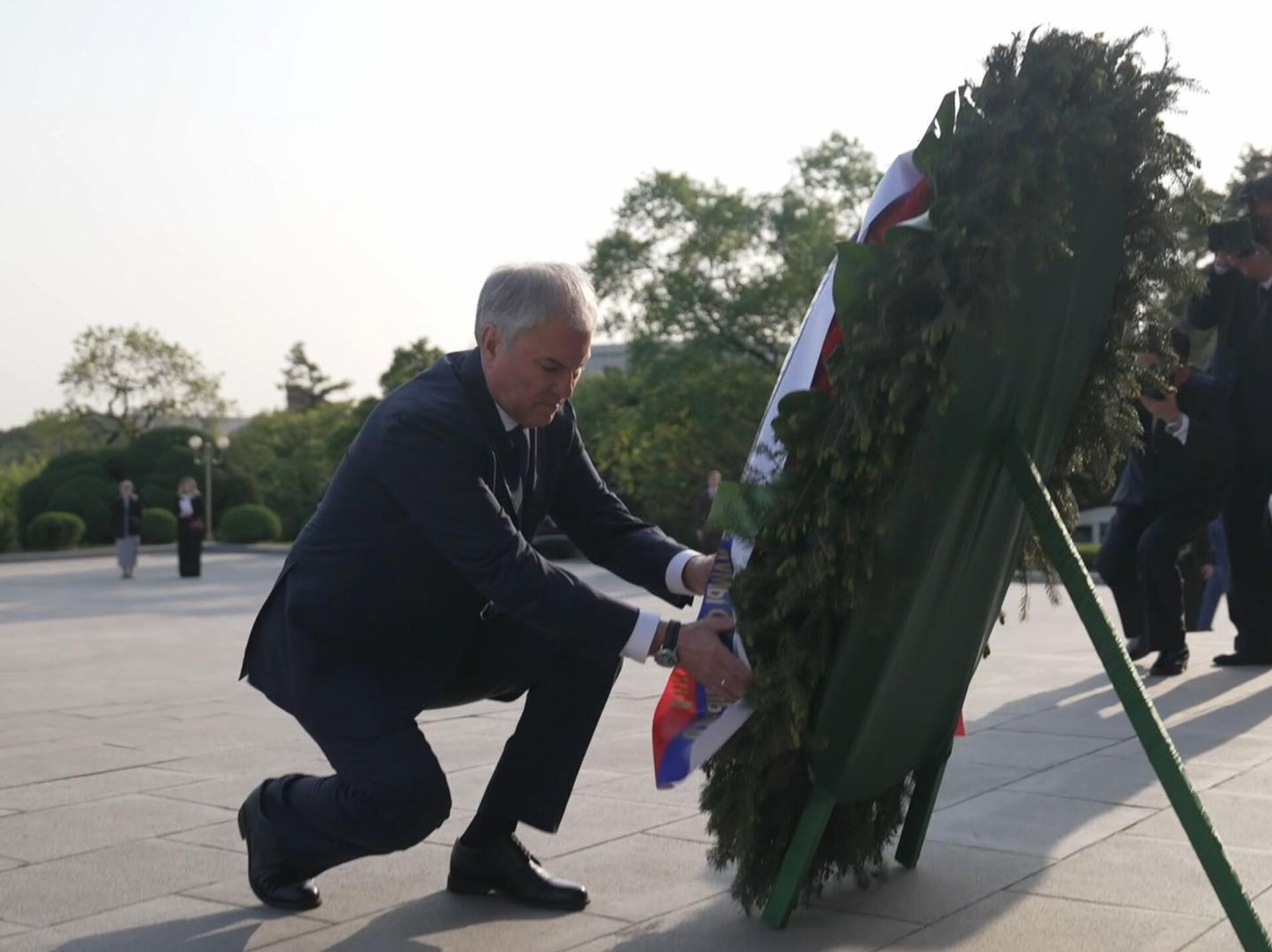 俄杜马主席向平壤解放塔献花圈,缅怀解放朝鲜的苏联先烈